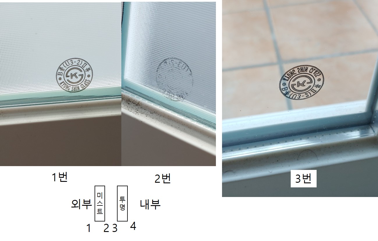 1) 첨부 사진 1번과 2번은 모두 베란다의 로이코팅된 복층 미스트 단창인데 외부측 유리는 미스트이고 내부측 유리는 투명 같습니다. 나란히 있는 창인데 사진 1번과 2번처럼 투명 유리에 찍힌 마크 하나가 뒤집혀 있습니다.