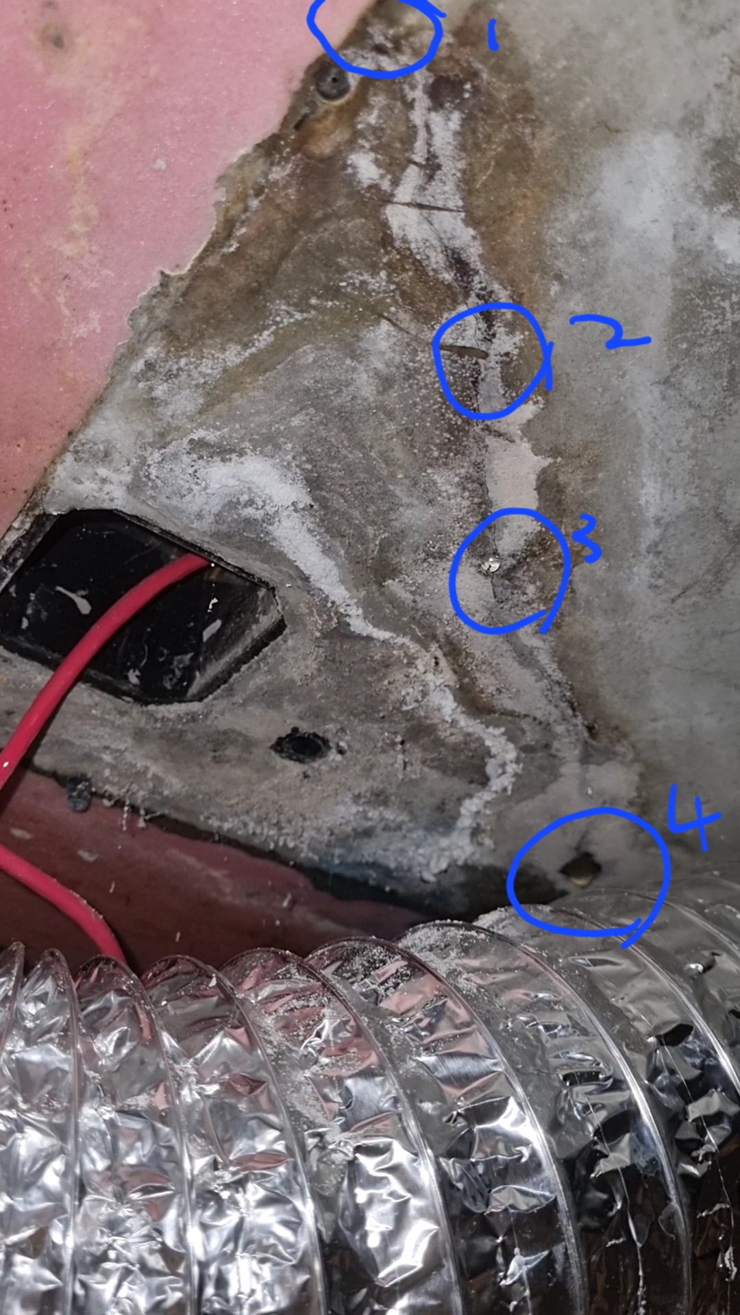 천장 구멍과 금 사이에서 계속 물이떨어져요.(총4곳 파란동그라미)
