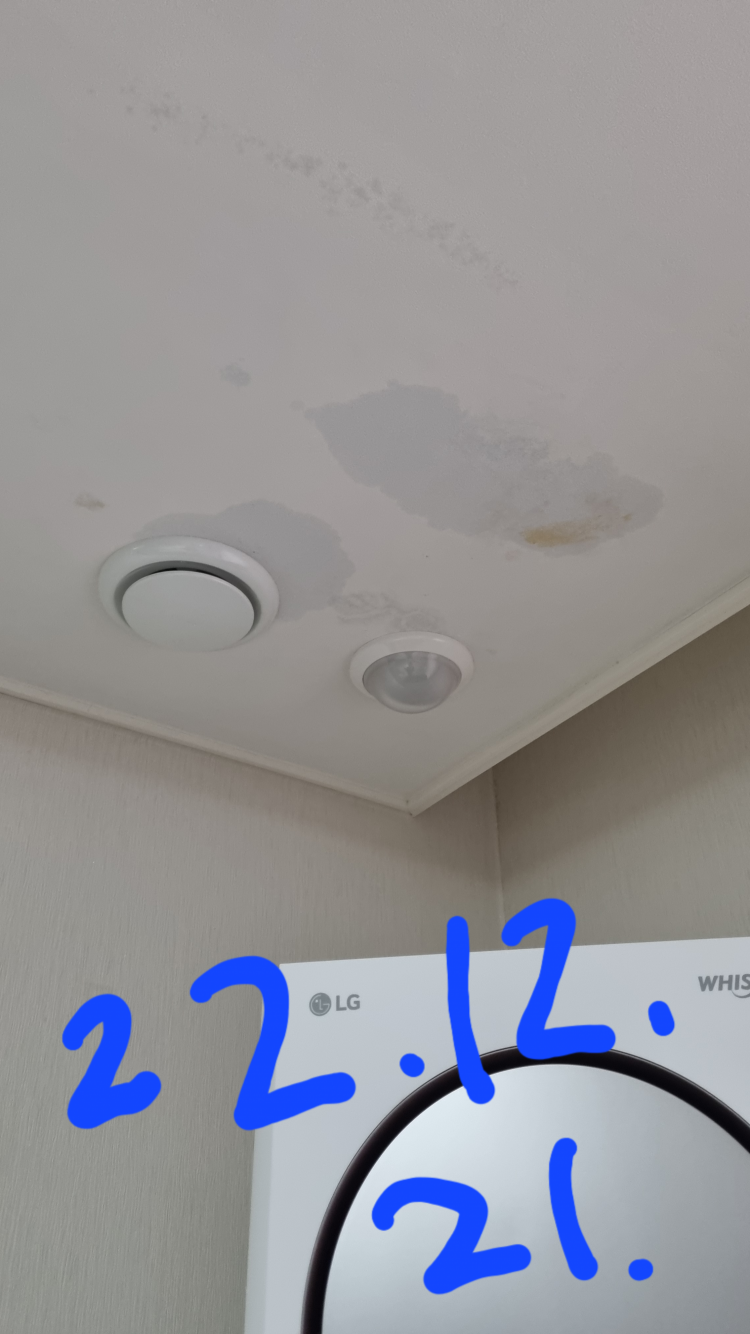 관리실에서 나와서 천정에 물이 새는거 확인하고 2023년 7월 21일 날짜를 차장님이 써놨고 그 후로 태풍도 오고 장마비도 엄청 왔음에도 불구하고 물이 새지 않았습니디ㅣ