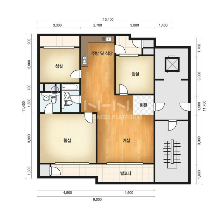 [ 첨부 ] 아파트 평면도와 물이 흐르는 내벽의 위치 표시