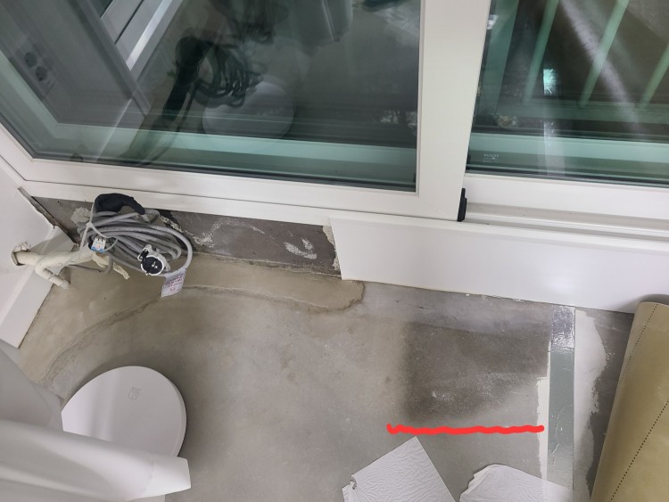 그런데 장판을 좀 더 걷어보니, 비가 안온지 약3주가 지났는데도  샤시 중앙쪽 빨간 표시한 부분이 계속 젖은 상태였습니다.