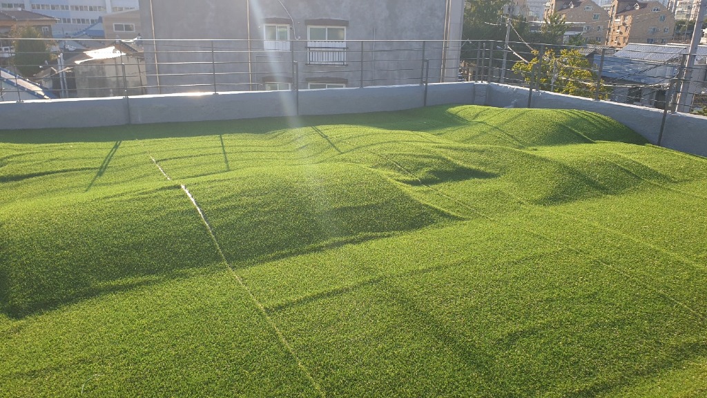 그냥 지금과 똑같이 하시고 그 위에 쇄석을 깔고 인조잔디 그대로 덮으시면 되세요. 다만 인조잔디를 너무 끝까지 다 덮으면 그 역시 그 내부의 온도가 올라 갈 수 있으므로, 테두리를 따라서 통기구는 필요합니다. 물론 어떤 인조잔디냐에 따라서도 다르긴 합니다만.. 뒷면에 구멍이 많은 표면이라면 필요없고요..