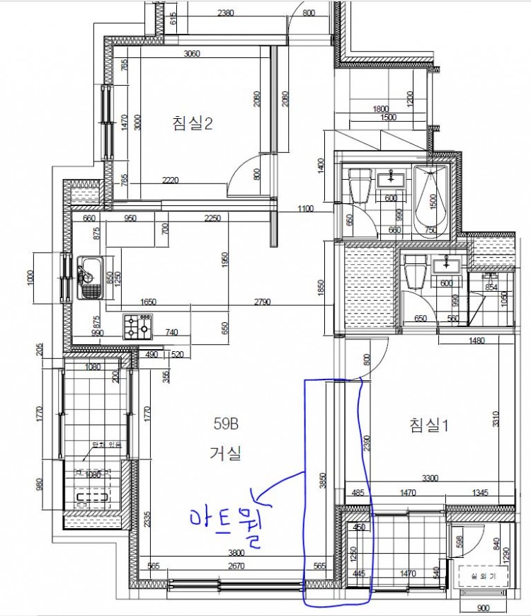 위에 언급드린 천장 냄새 문제가 발생한 시점(올 5월 경)부터 거의 비슷한 시기에 또 다른 증상이 있엇는데요. 거실 아트월쪽 주위에 가면 시멘트 젖은 냄새(?) 지하실 습한 냄새 같은게 쌓여 있는 것 처럼 냄새가 났습니다. 항시 그런 시멘트 젖은듯한 습한 냄새가 나는건 아니고 날씨나 바람강도 같은 거에 따라서 냄새가 더 심하게 나올 때가 있고 좀 덜할 때가 있기는 합니다. 특히 바깥 창문을 다 닫은 실내 밀폐 상태에서는 냄새가 안나구요, 문을 열어서 대류 흐름이 있을 때 오히려 비가 오지 않은 맑은 날에도 습한 냄새가 더 심해지는 경향은 확실한 것 같습니다. 아트월쪽 구조를 확인해보니 아트월 뒤로 콘크리트 내력벽 반+가벽(창가쪽)에 바로 접착되어 붙어 있습니다. (첨부 그림 1 참조)