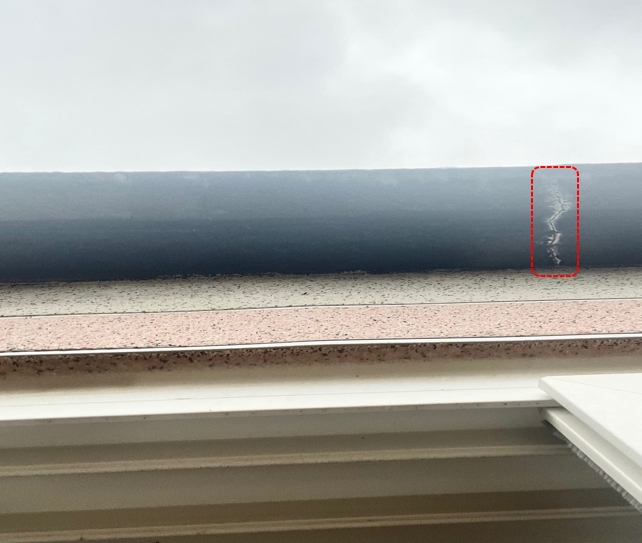 다른 사진에서는 이런 흔적이 보이지 않습니다만, 어차피 보수하기 위해서는 고소작업차(일명 스카이)가 필요함으로 창틀 상부를 전체적으로 점검하여 보수하는 게 좋겠습니다.
