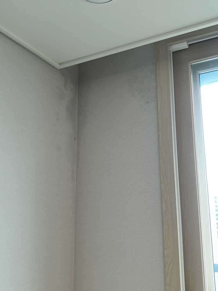 그런데, 2022.6월경에 거실 우측 창틀 일부, 좌측 모서리쪽 바닥과가까운 곳과 천장과 가까운 곳에 벽지가 또 젖어있었습니다.ㅜㅜ