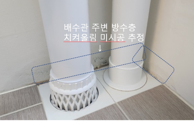 맨 위 사진을 확대해서 보면 배수관 주변 치켜올림(벽면의 수직부위) 방수층 형상이 보이지 않은 것으로 보아, 두 배수관이 놓여 복잡한 부위 바닥과 면한 벽면 방수층이 제대호 형성되지 않은 것 같습니다.