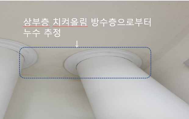 좌측 배수관은 발코니 바닥 물을 처리하는 관이고 우측은 옥상에서부터 내려오는 우수관인데, 우기 시 배수량이 많으면 우수관 접합부인 소켙에서 물이 튀는 경우가 있습니다. 이때 아래 그림 점선 안 수직부위 방수층이 제대로 형상되지 않은 것으로 추정되는 곳이 젖었다가 아래층 발코니 천장까지 젖은 것으로 여겨집니다.