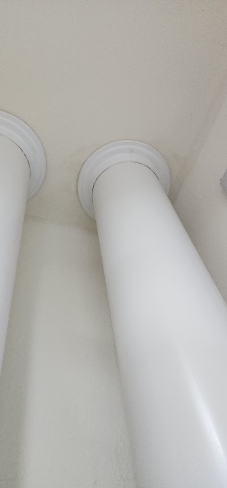 상부 두 배관 사이에 균열 발생 여부를 확인하기 위해 확대해서 살펴봤는데 균열이 없는 것으로 보아, 위 치켜올림 방수층 부위에서 젖은 수분이 벽면에 닿은 슬래브를 적시면서 천정 표면 일부까지 습한 환경을 만든 것으로 추정됩니다.
