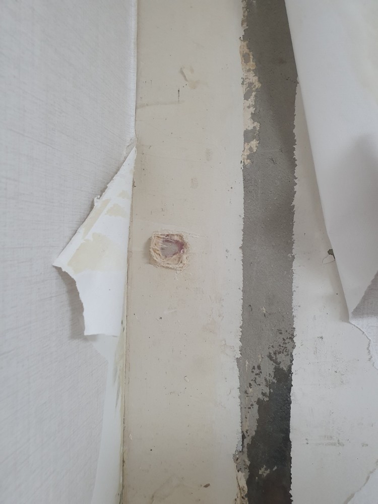등을 의심하셨으나, 물자국이 커지지않고 유지되어 벽지를 열어보니, 두번째 사진처럼 그 쪽만 석고보드가 젖어있었습니다. 업자분께서 파보시면서 안에 핑크색 단열재가 얇게 처리되어 있고, 안에 벽(시멘트벽? 벽돌벽?) 은 젖어있지는 않다고 하셨습니다.
