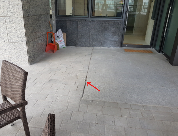 사진과 같이 외부 보도블럭 바닥과 만나는 홀 바닥의 석재면 사이 , 지하주차장 콘크리트 바닥과 만나는 복도의 타일 등의 바닥과 만나는 이질 마감재 접합부 사이에 재료분리대를 사용해야 하는 설계규정이나 법규같은게 있을까요?