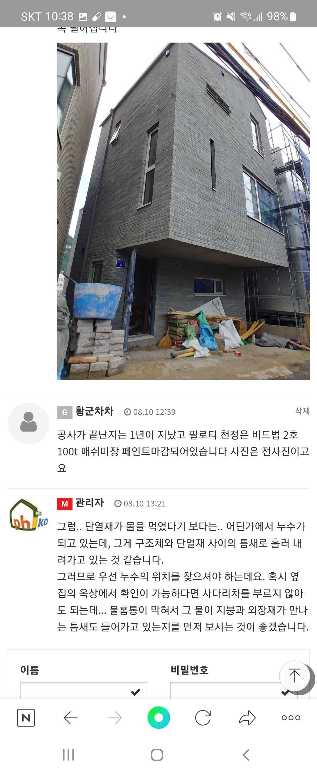 예전에 제가 비가많이오면 필로티 천정에 물얼룩이 생긴다는 글을 올린적이 있습니다 사유중 관리자님께서 창호주변 누수로인해 단열재 뒤로 물이 넘어가서 그럴가능성이 있다고 하셨었는데 말씀 그대로 저희집은 큰짐을 2층큰창으로 이동하는데 그과정에서 창호에 설치한 난간을 탈부착해야 하는데 그과정에서 부착후 실리콘 처리등을  하지않아 물이넘어가 문제가 생긴듯 합니다