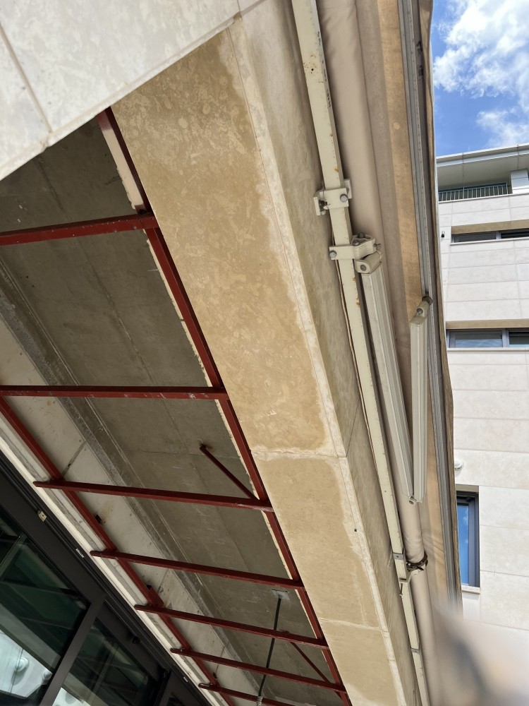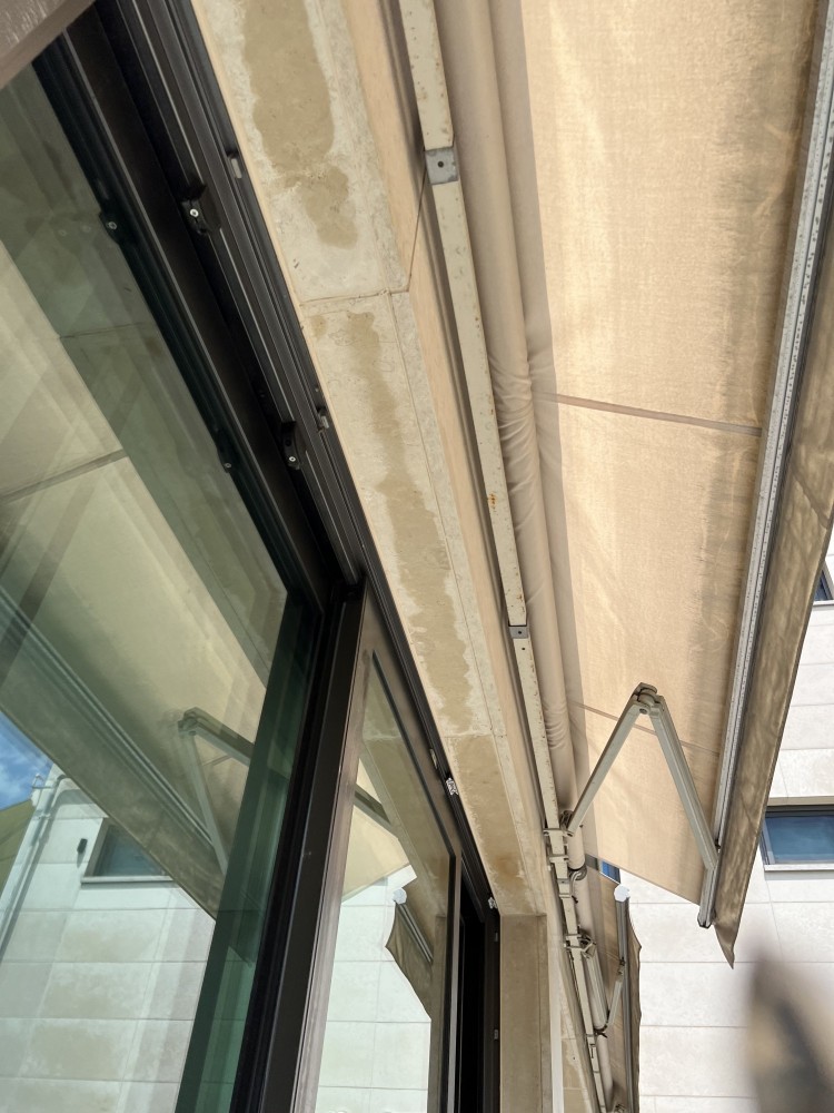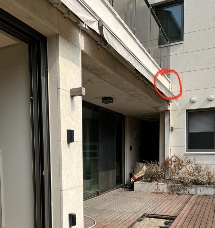 계단식 구조의 아파트로, 첫번째 사진처럼 저희가 인테리어 중인 세대의 천정쪽이 윗집의 테라스가 위치한 구조의 집입니다. 이번에 비가 많이 오면서 첨부되어있는 사진처럼 저희 세대의 테라스쪽 창호 상인방에 물먹음이 생겼습니다.(백화 등의 흔적으로 보아 지속적으로 있어온 문제로 보입니다. 마감재는 라임스톤 류입니다.)