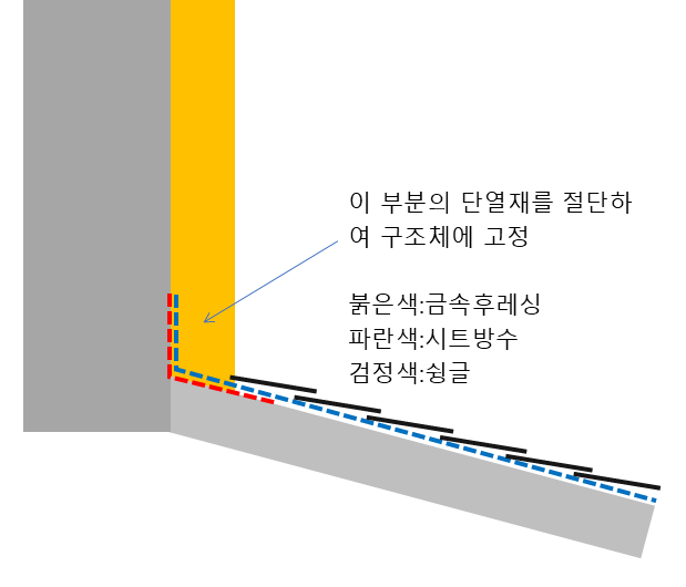 아래 그림처럼 단열재를 절개해서 그 속으로 아연도금 금속판으로 후레싱을 만든다음, 그 위에 새로운 지붕이 올라가는 방식이어야 합니다.