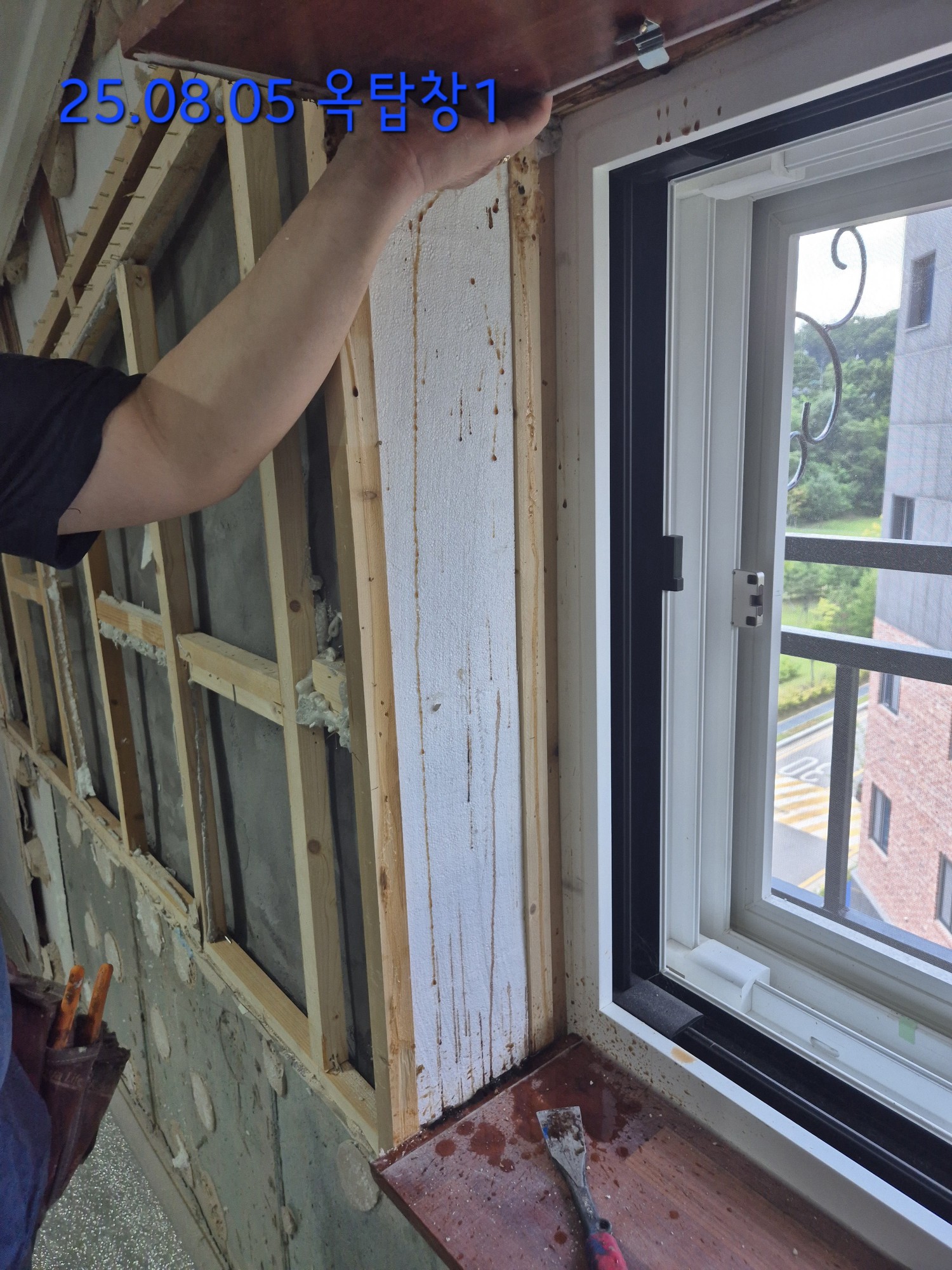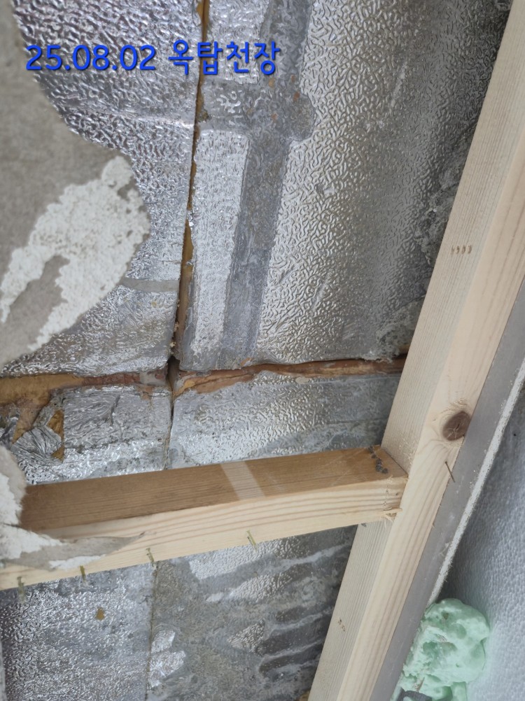 옥탑에 석고보드와 내단열재를 뜯어 비가 새는지 확인을 했지만 옥탑에있는 창문 3개 모두 창문 프레임 하단에(벽체를 뜯어야만 보이는 부분) 물방울이 맺혀있고, 내단열재(스티로폼)에도 물방울이 보였으나 벽체나 천장에선 물이 흐르는 증상은 없었습니다.