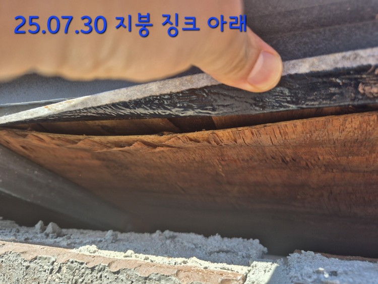 지붕(징크)을 뜯어 확인을 했을땐 징크 밑에 합판이 수분유입으로 손상된거 외엔 시공상의 문제는 없어보였습니다.