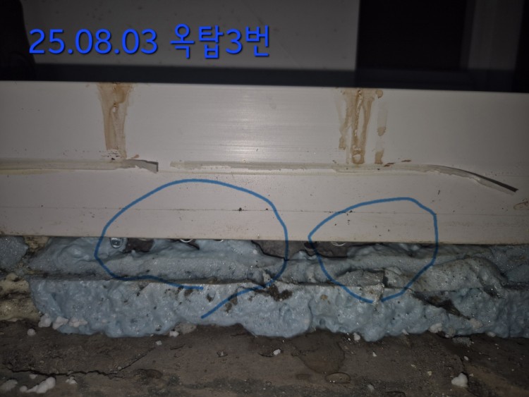 물유입이 최초발견된 시점은 옥탑 픽스창 23.7월경(내부마감공사중) 이후 계속 장마기간엔 4층 거실샷시,작은방창문 물샘. 지금은 멈췄다가 몇주전 장마때 작은방 물샘.