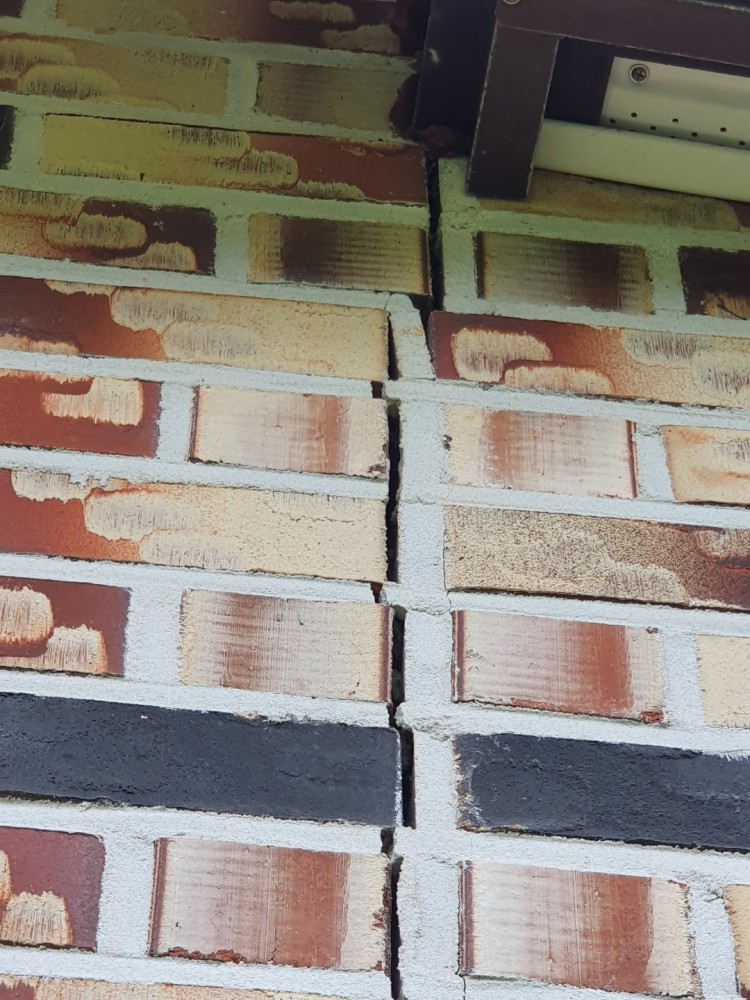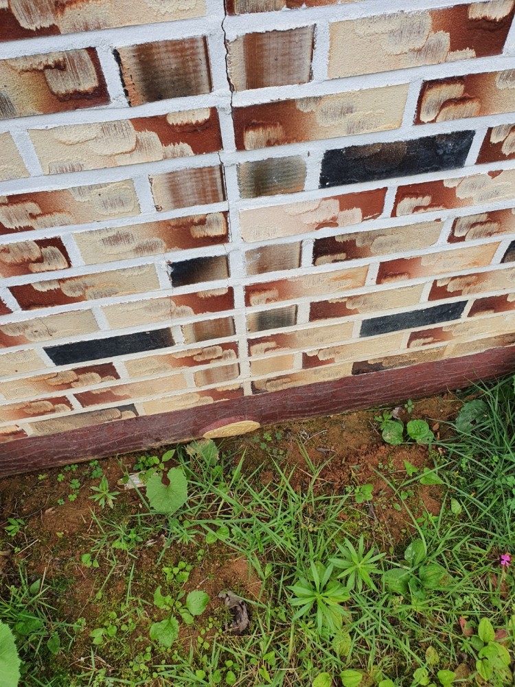 사진 상으로 봐서는 아마도 익스팬션조인트(E.J)를 계획하고 벽돌을 일부러 통줄눈으로 시공한 듯 보입니다.