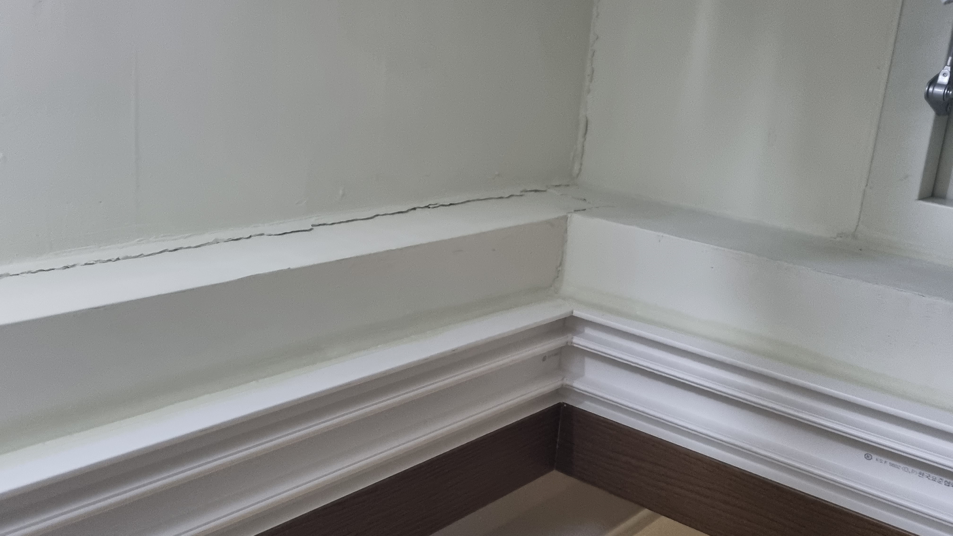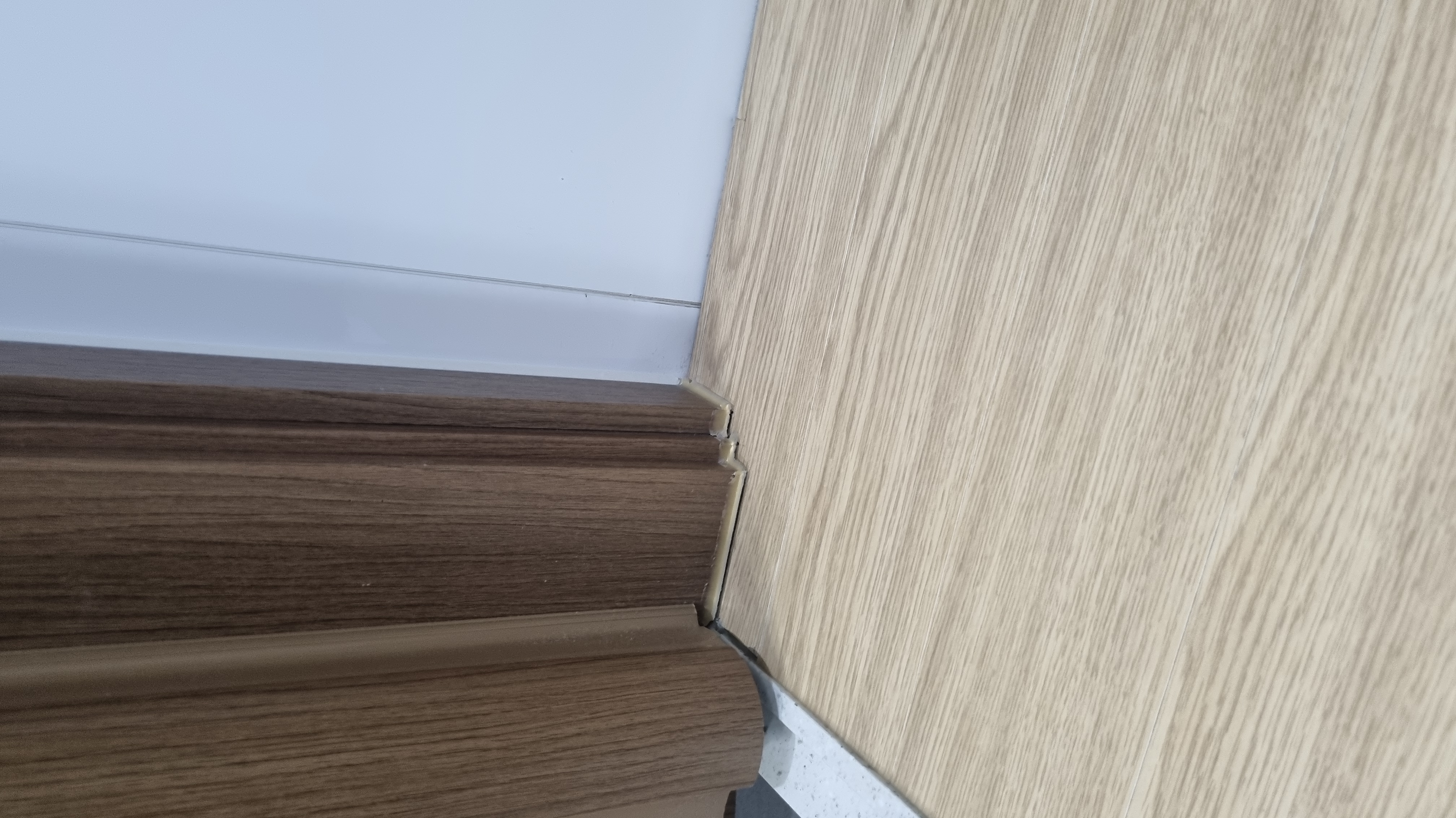 걸레받이와 강마루 연결 코킹은 전반적으로 벌어짐 현상이 있습니다.