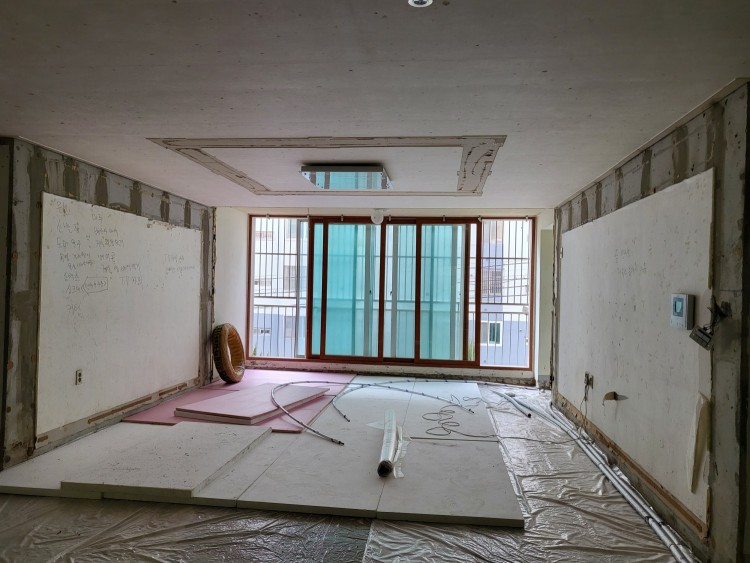 작업자 중 한 명은 몰탈이 너무 얇게 깔렸고, 강도가 너무 쎘던거 같고, 소리의 원인을 기존 아이소핑크와 그 아래 깔린 화이트 스티로폼 사이에서 습기가 찬 거 같다고  하였습니다. (실제로 현장에서 만난 여러 작업자분들 또한 아이소핑크, 차광막, 습기가 문제라고들 하셨습니다.) 소리의 원인을 정확히 알 수 없으니 다 철거해야 해서... 바닥을 내딛을 때 찌그락 소리가 나는 것으로 보아 바닥 상황이 홈파기를 할 수 있는 상황일지 모르겠습니다.