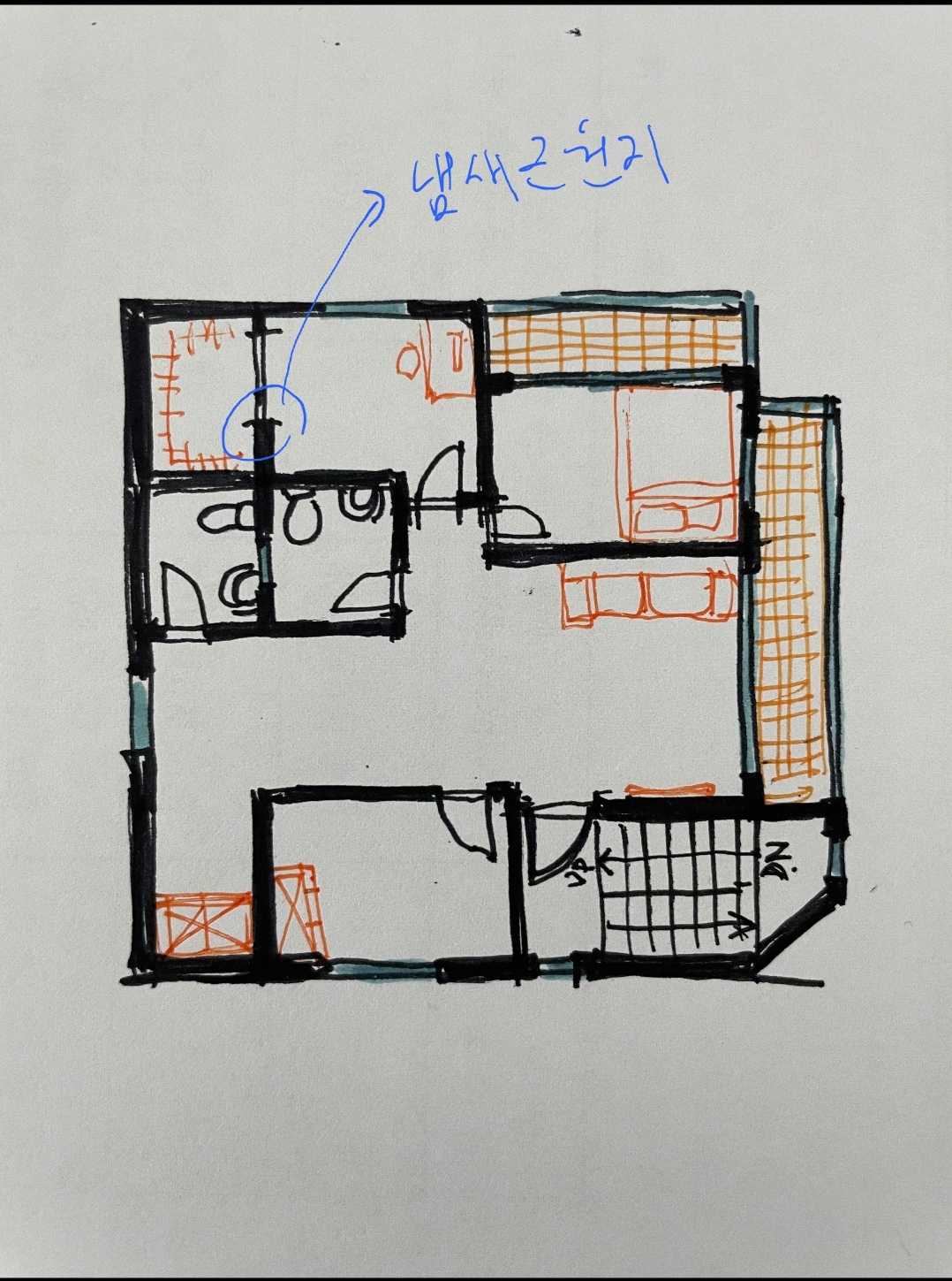 냄새가 심한 스위치의 전선이 화장실 쪽에서 끌고 왔으리라 예측되기는 하나, 아마도 현장의 상황을 반영한 전기도면은 찾지 못할 것이기에.. 직접적인 해결은 어려워 보입니다.