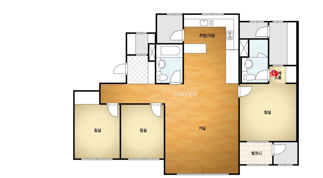 평면도에 동그라미 친 부분입니다. 화장실 입구 근처 드레스룸  입구 근처 입니다.