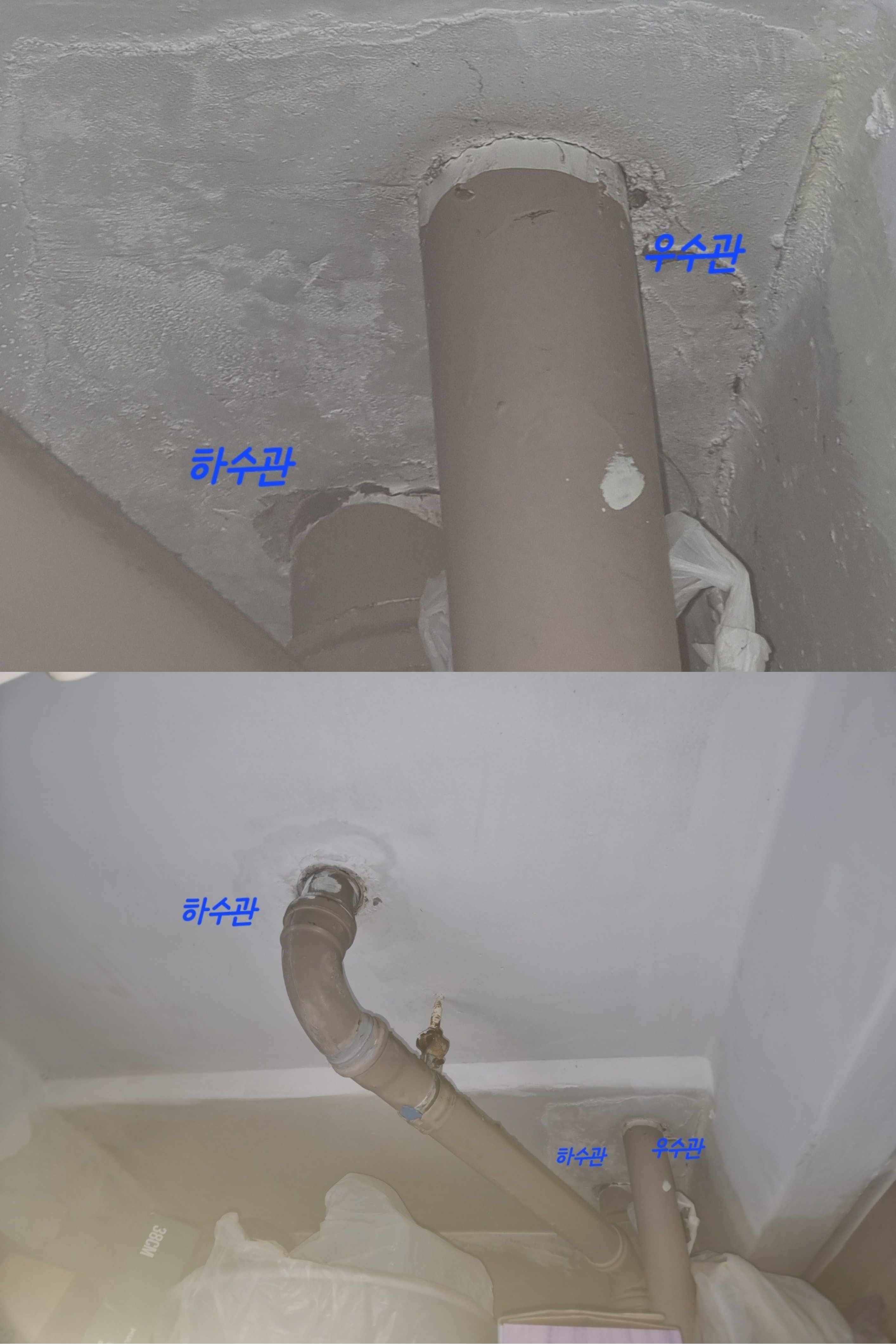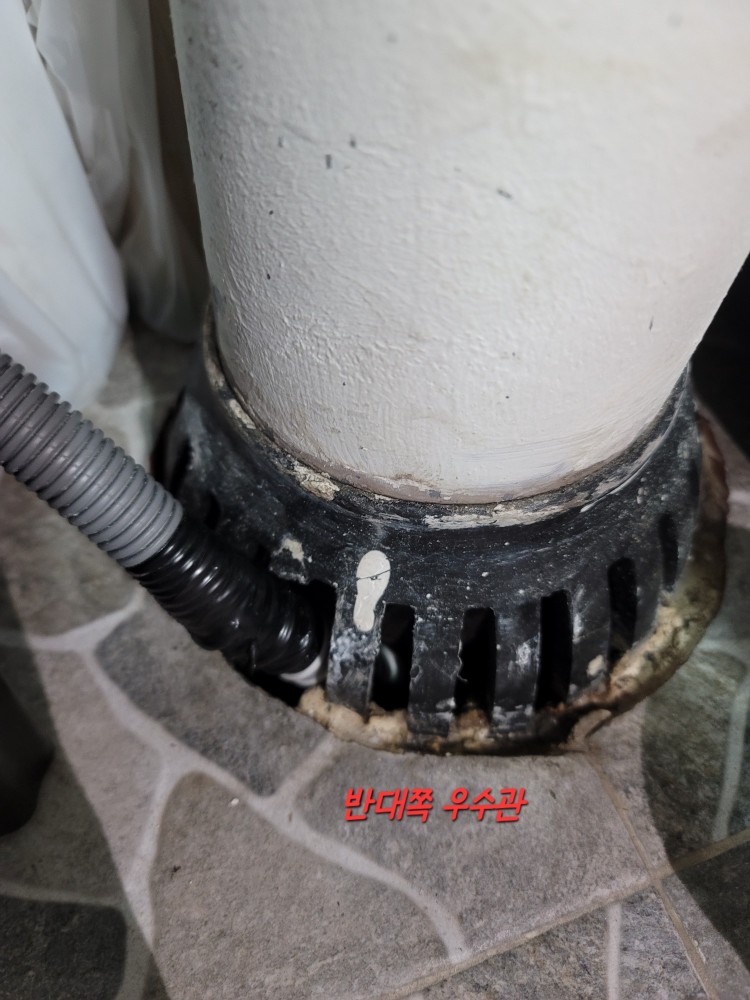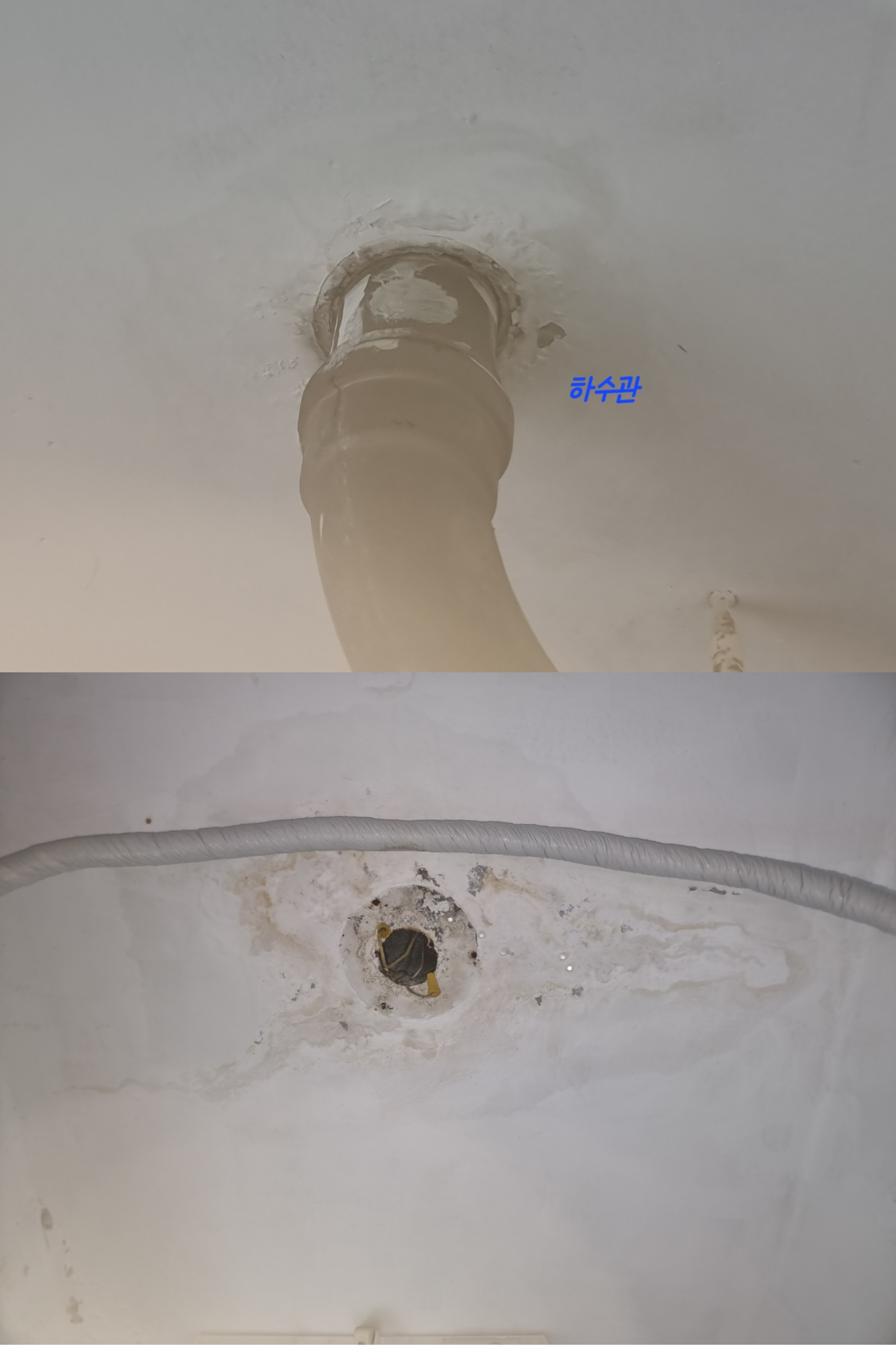 첨부된 사진은 저희 집 우수관, 오수관, 반대편 우수관 사진과 아래층 천장 누수 사진입니다.