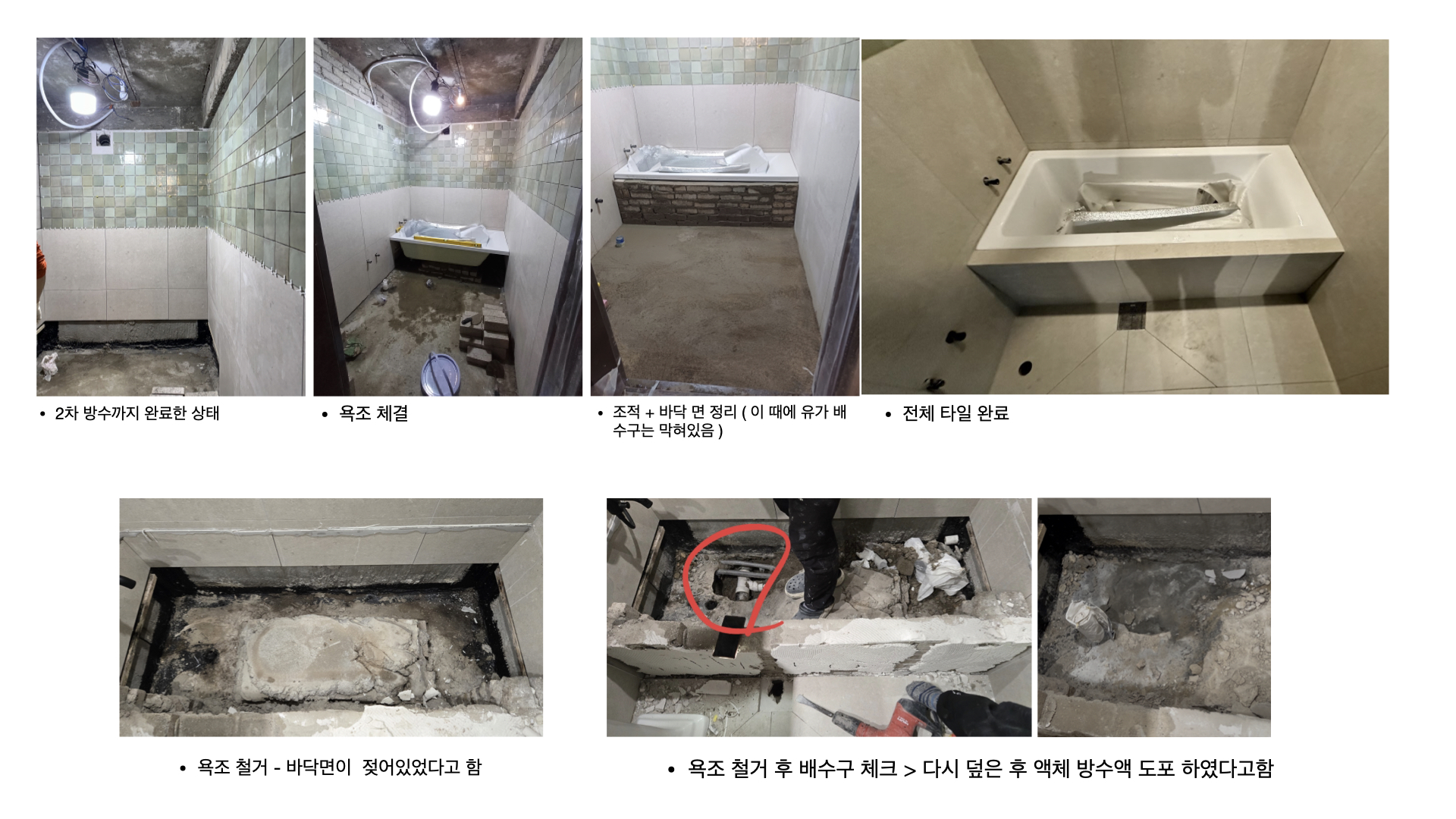 그래서 해당 사항들 토대로 인테리어 업체에 as 요청드리고 욕조 철거하여 확인 후 배관이나 누수 방수문제 아니라고 (시공 하자가 아니라고) 말씀주신 상태 이며, (욕조 밑으로 전체 배관이 통하기 때문에 욕조만 철거해도 확인 가능하다고 하심)