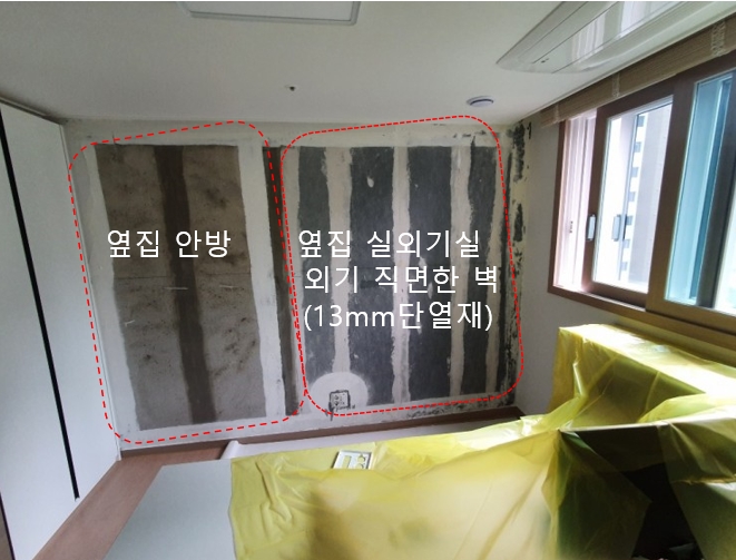 질문내용 2: 벽의 절반은 단열재 13t, 나머지는 콘트리트이고 단열재인 부분은 옆집의 실외기 실