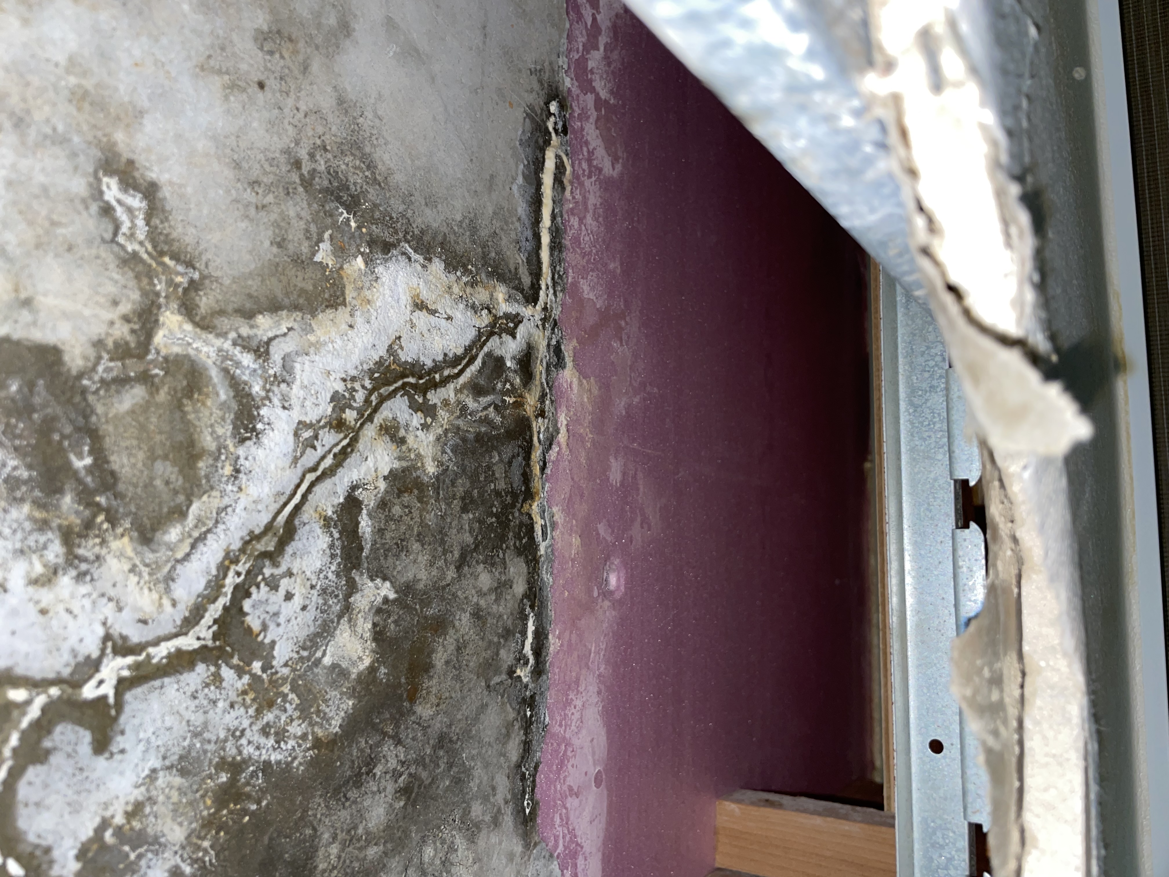 사진의 분홍색 부분이 창호방향의 단열재로 보이는데, 분홍색 단열재가 창호위치까지20센티 이상의 두께는 되어 보입니다. 그런데 자세히 보면 오래된 백화현상 부분은 마치 창호단열재에 부딪혀 물누수의 방향이창호단열재쪽에서 반대방향으로 옮겨온거 같은 형상이 있습니다.