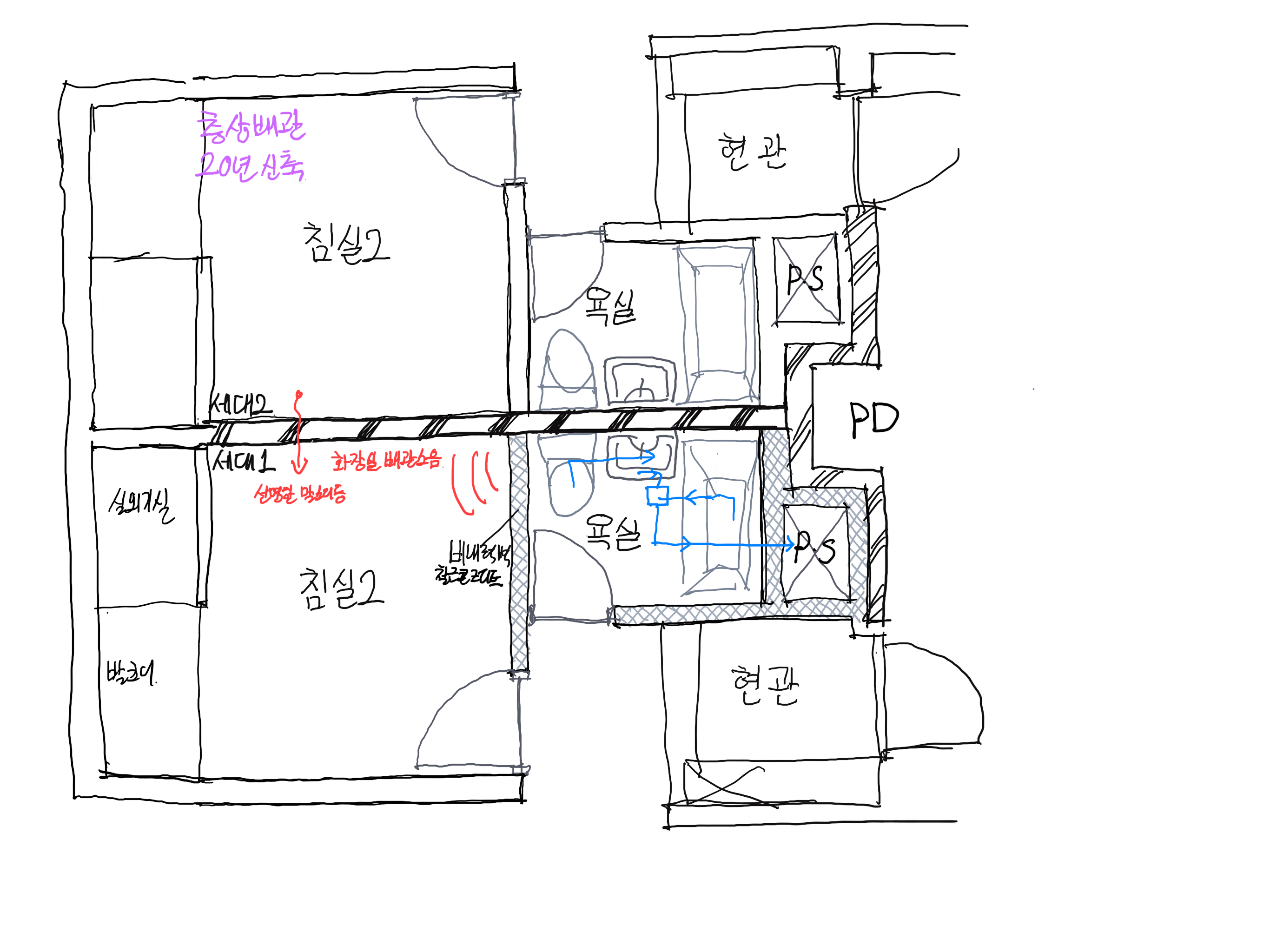 먼저 제가 생각한 2.번 하자에 관해 제가 예상했던 문제를 말씀드리겠습니다. 완전하게 취합한 것은 아니지만 대충 상황을 보자하니 , 우리 세대는 물 흐르는 소리가 난다는 불편사항 접수가 없고 다른세대만 있는데요 다른세대와 우리집의 큰 차이점이 우리집은 수직배관 샤프트가 거실화장실,안방화장실 몰려서 코어부분으로 빠져있습니다.  이 구조적인 차이 때문에 다른세대에서 배수소음이 발생한다 싶어 ps위치와 ps의 조적벽이 원인이라고 거의 확신했지만 왠걸 막상 단위세대 평면도와 그 부위를 받아보니(엇그제 본문을 막 작성완료 했을 즈음) 안방이 아닌 침실2의 화장실이라고 합니다.  ps 비내력벽 철큰콘크리트로 되어있으며 배관 또한 층상배관, ps도 외부쪽으로 잡혀있네요.