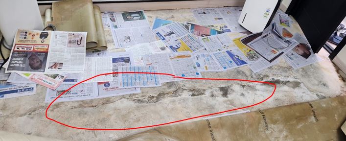거실쪽도 장판을 걷어보니, 많은양의 물기와 사진과 같은 크랙을 발견하엿습니다.