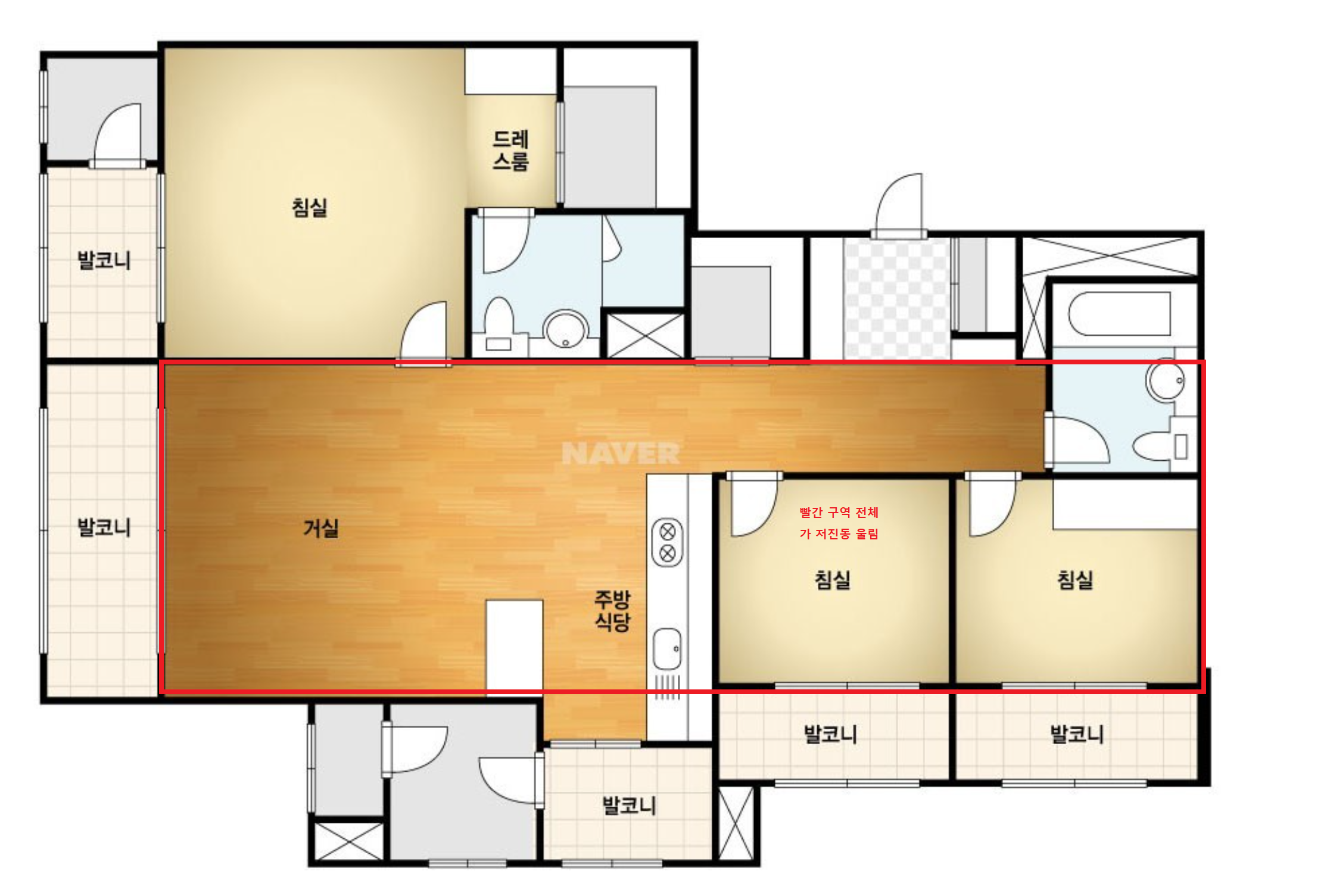 입주 후 부터 그림에 표기 된 빨간 구역 전체가 저주파 진동 처럼 울립니다...