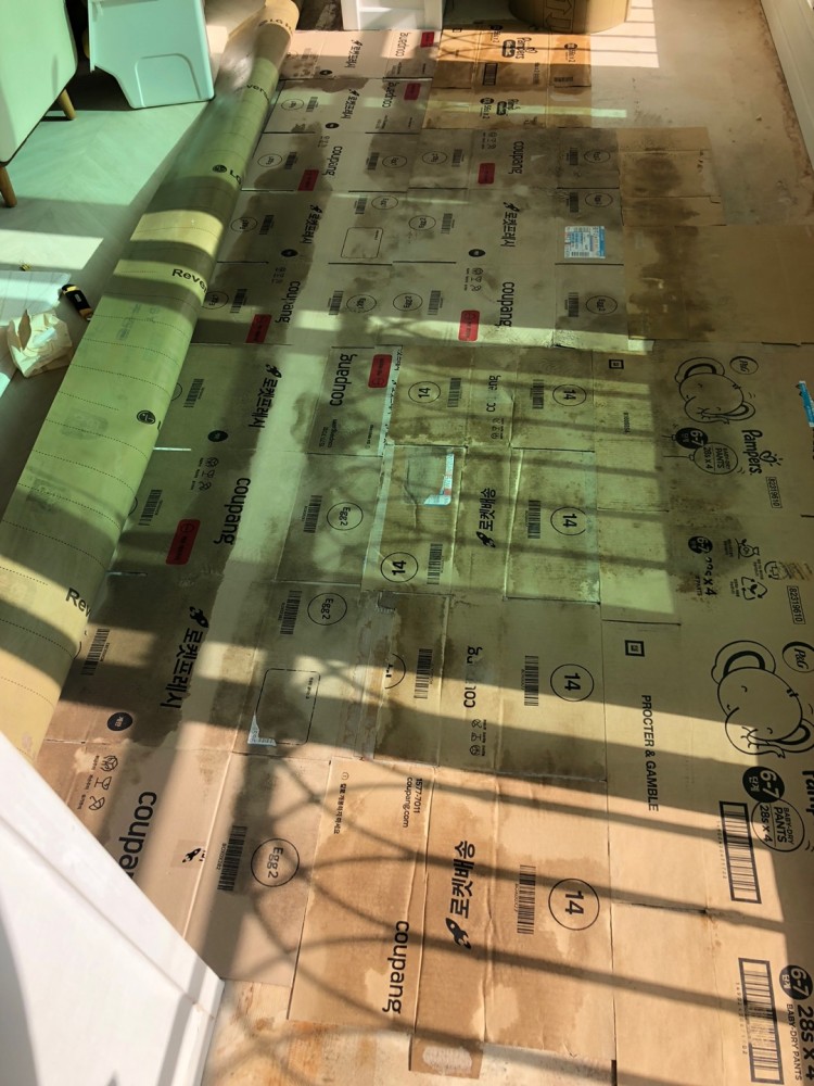 20년 넘은 구축 아파트이고 확장했습니다. 오래된 건물 크랙 때문인지 샷시 부실시공 때문인지 빗물이 스며들어 코킹작업하고 곰팡이 핀 걸레받이, 벽 전부 다시 시공했습니다. 그런데 바닥이 마르지 않아서 장판은 실리콘작업 하지 않고 상자를 깔아 물 흡수하고 주기적으로 갈아주는 식으로 관리하고 있습니다. 어린 아이들이 있어서 완전히 열어놓지 못하고 있어요. (다시 장판에 점같은 곰팡이가 퍼지고 있더라구요ㅠ)