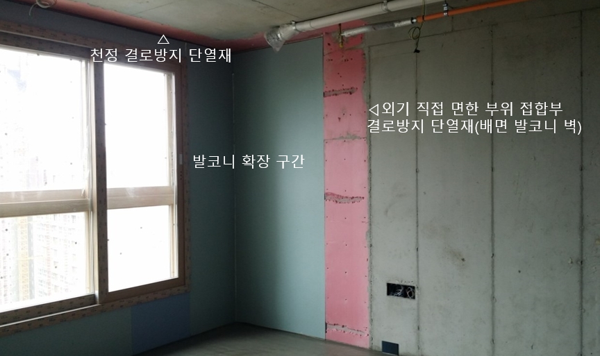 해당 벽의 끝(외벽과 만나는 부분)에 결로방지단열재가 시공되어야 합니다.