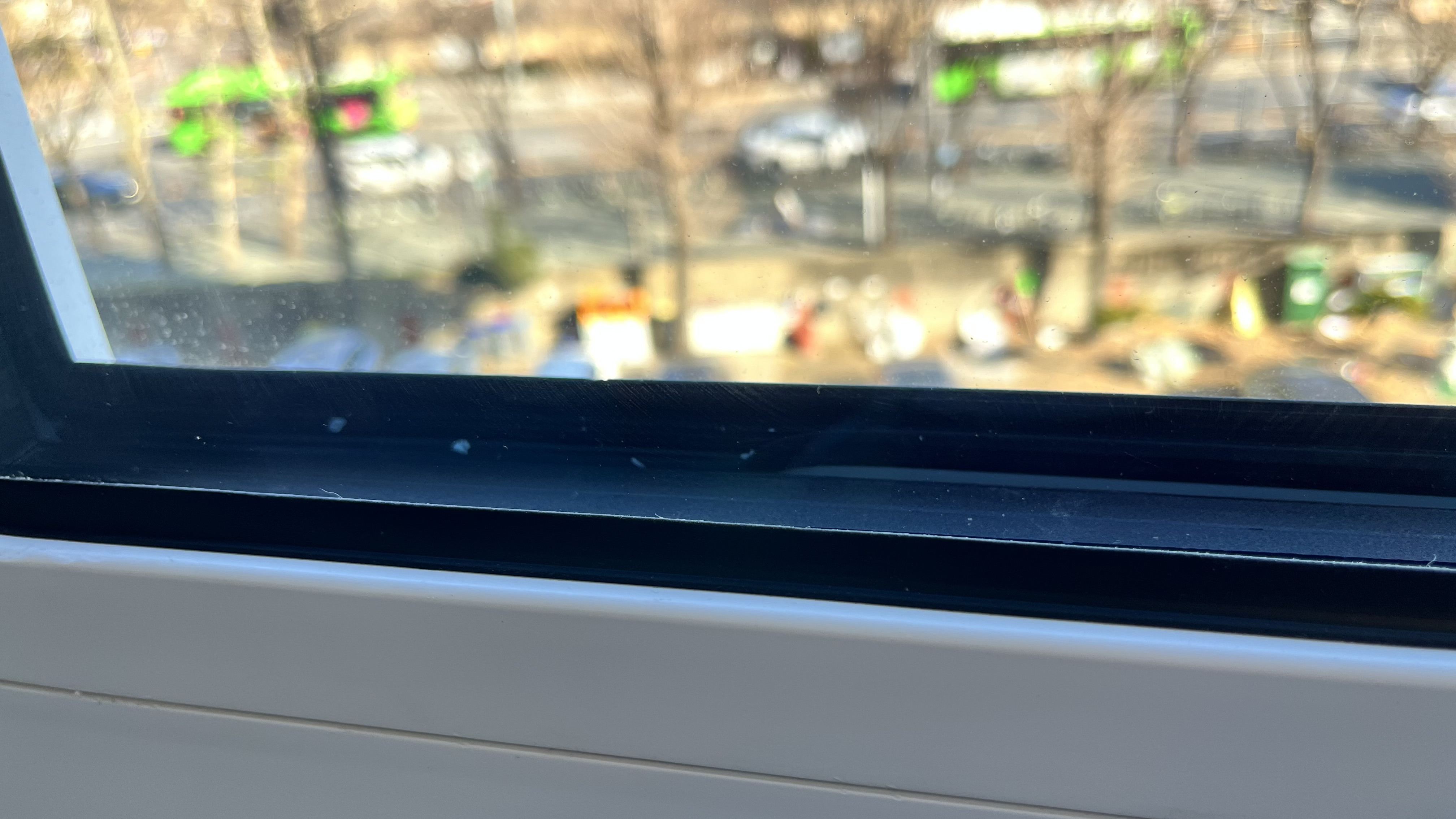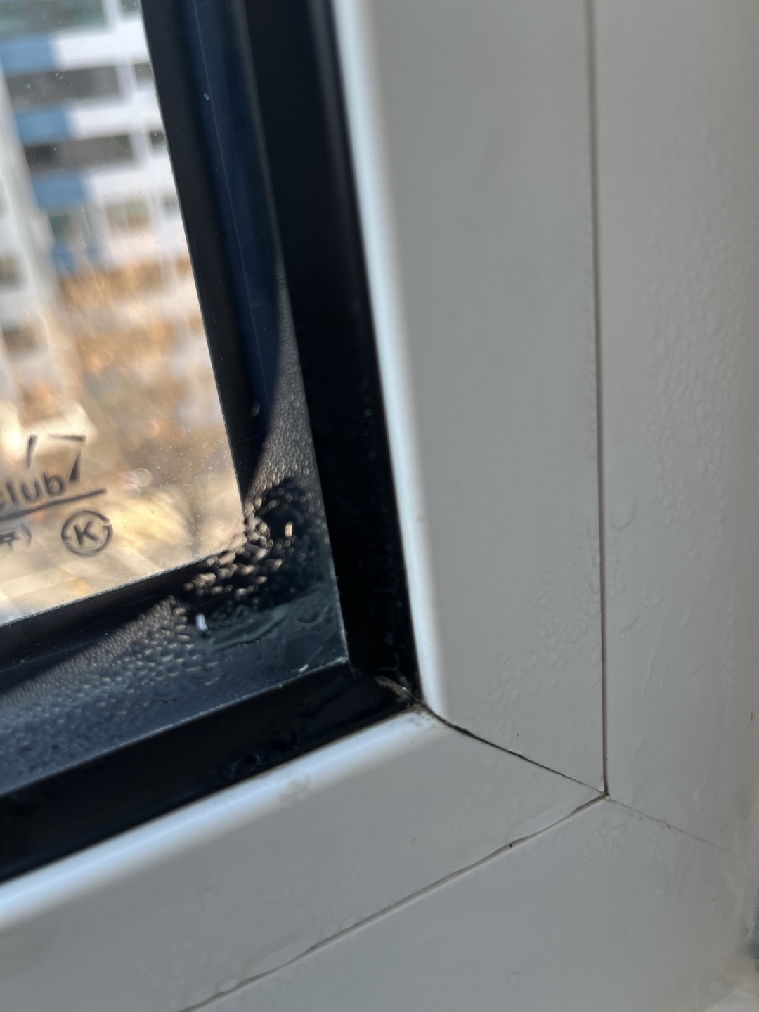 그리고 샷시 내부 유리 고정용 가스켓이 기역자로 만나는 부분에서 찬바람이 나오고 결로가 생깁니다. 실내 25도 습도 50%정도에서 커텐 없이 사진에서와 같이 생깁니다. 시공자는 프레임 내부로 결로 빠지는 구멍으로 공기가 유입되고 유리가 프레임 내부에서 떠있는 것이기 때문에 실내 가스켓 사이로 자람이 나올 수 있고 이는 기밀도에서 측정하지 않는 부분이라는 말을 합니다. 그래서 처리로는 구석 부분에 수달 폼을 쏘고 다시 가스켓으로 덮는 처리를 했습니다. 그럼에도 불구하고 그부분에서 바람이 새는 것이 느껴집니다.