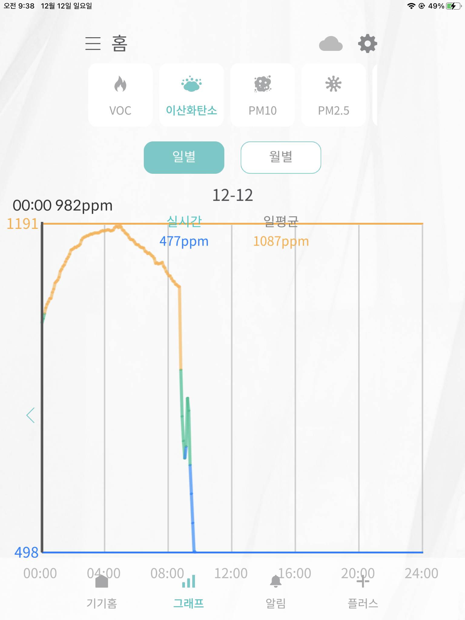 6시 400ppm 7시 563ppm 8시 639ppm 9시 683ppm 10시 761ppm 11시 882ppm 12시 976ppm