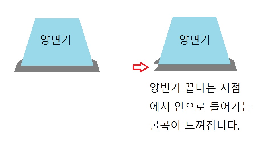 백시멘트가 충분히 있는 상태에서의 굴곡이라기 보다는 백시멘트가 얇게 도포되면서 양변기 끝나는 지점을 살짝 스치고 지난 듯한 느낌입니다. 거뭇거뭇한 부분이 양변기의 끝자락으로 보여요.