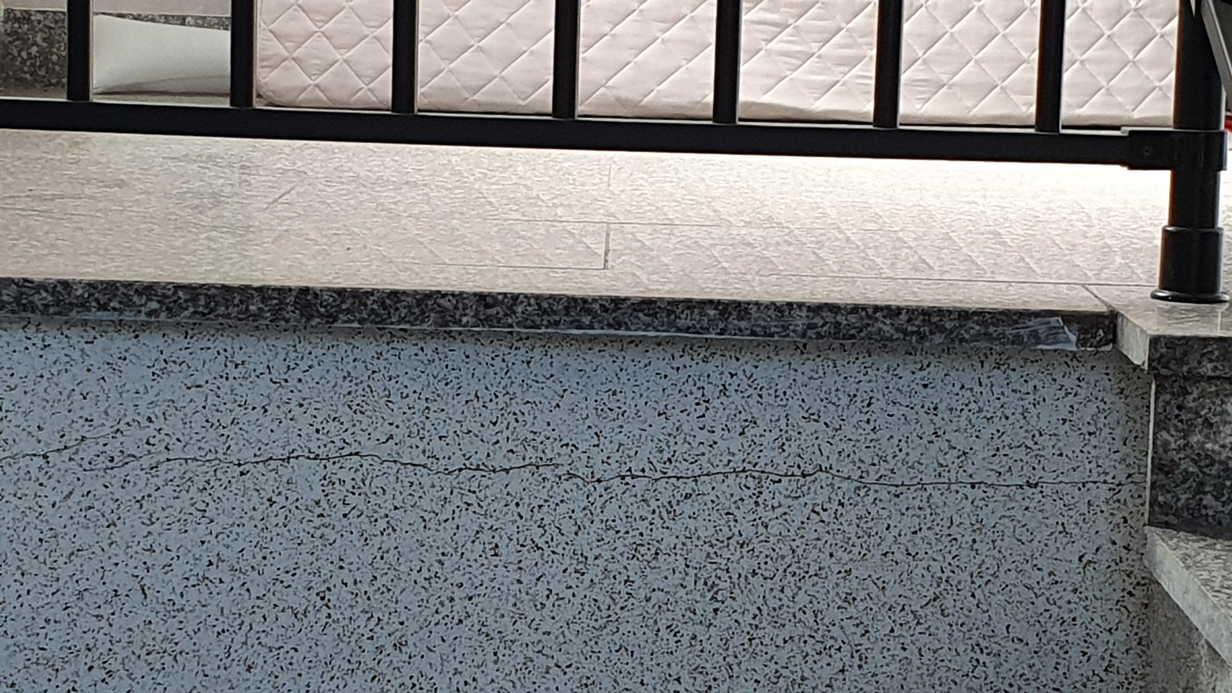 돌아보던 중 건물 옥상 외벽과 4층에서 옥상을 올라가던 계단 상단부에 약 60센치 가량 가로 균열이 가 있어