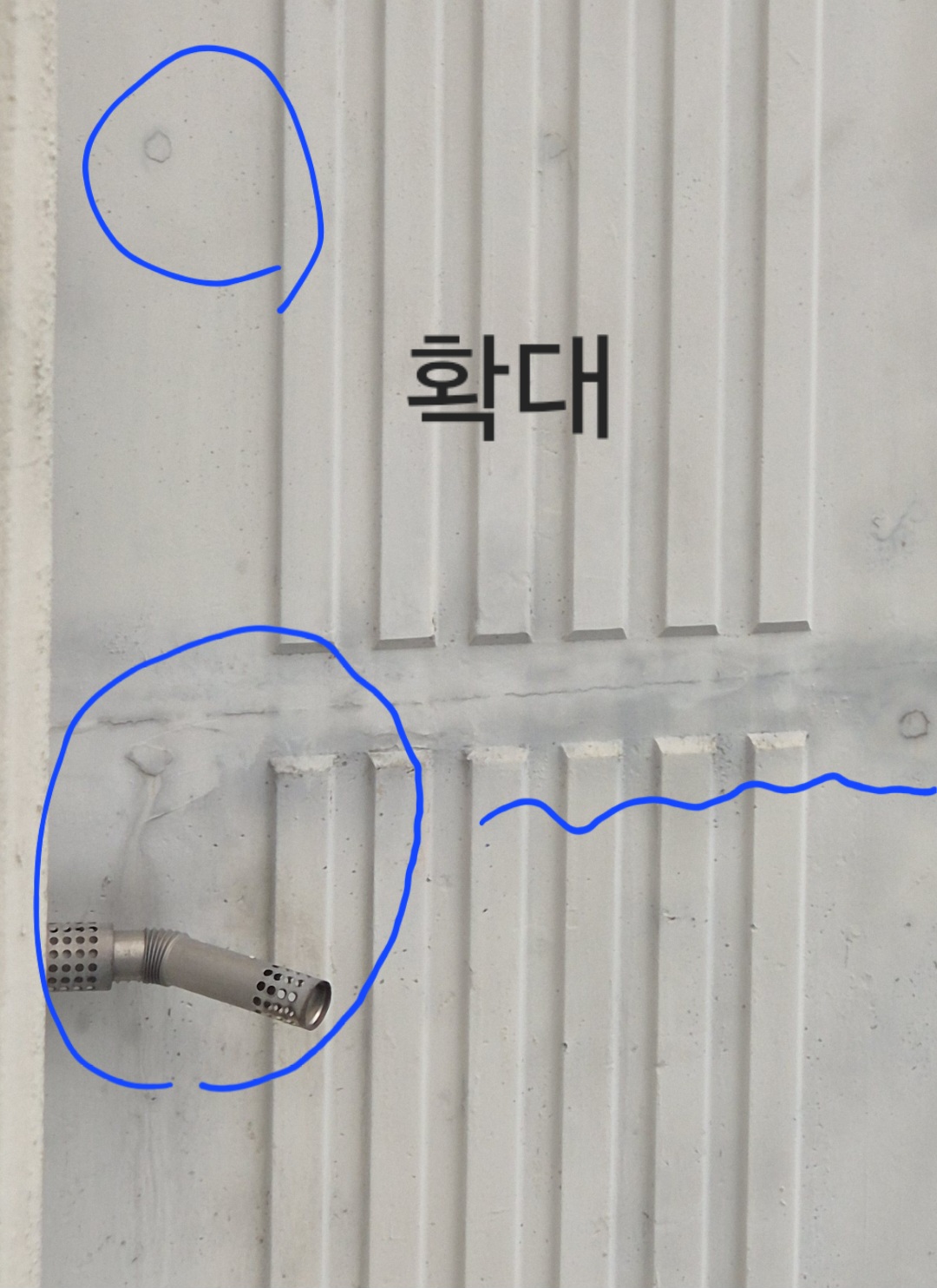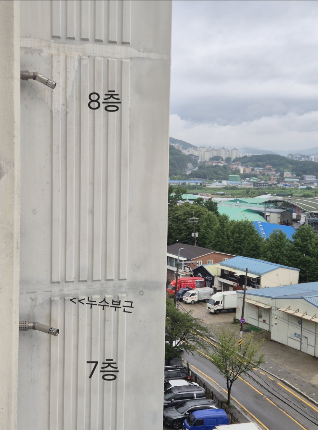 지난번 폭우에 계단실 외벽 사진을 찍어 본 결과 8층바닥층(7층 천장층)에 누수가 된듯한 부분과 물자국을 발견하게 되었는데요