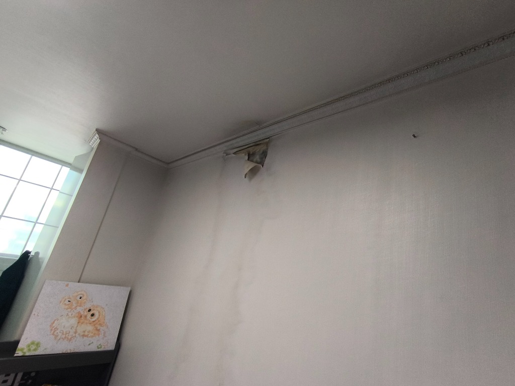 누수 양상이 외벽쪽에서 부터 물이 흐르는 것이 아니라 창문과 외벽에서 동떨어진 곳에서 누수가 시작됩니다.