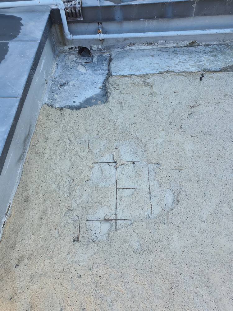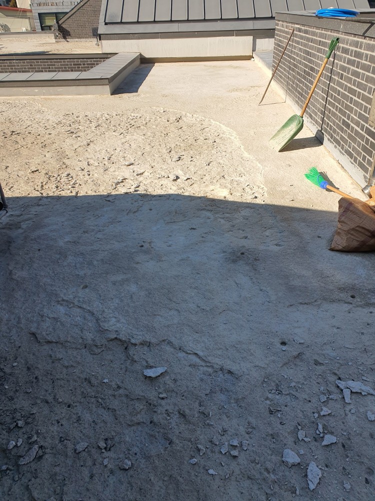 우레탄도막을 제거하고 보니 무근콘크리트가 아닌 레미탈이 타설되어있음을 알게되었습니다. 마지막 옥상타설을 12월 말에 해서 인지 우레탄도막 하부 2-3cm가 얼었었는지, 텅텅거리고 부슬부슬 다 떨어지는 상태고요.