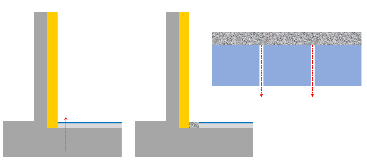 아래와 같이.. 벽과 붙어 있는 석재를 들어 내서 틈을 벌리고.. 그 곳에 습기의 배출에 용이한 쇄석을 까는 방법이 유일할 것 같습니다.