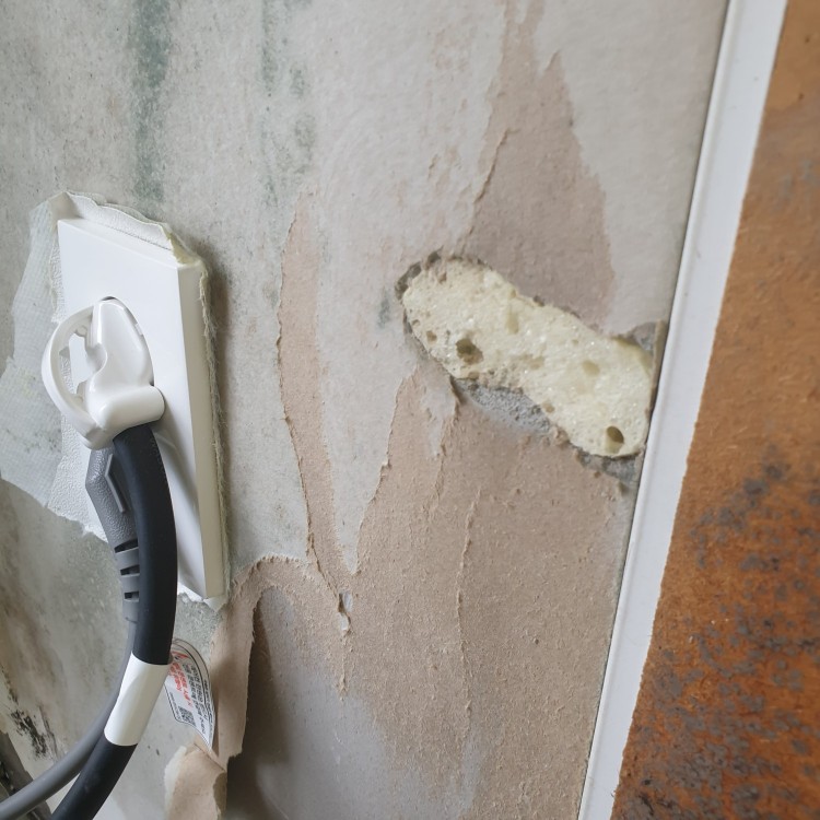 거실 스탠드 에어컨 드레인 배관 누수로 인하여 배관주변 석고보드 및 벽지에 곰팡이가 생겼고, 아랫집 천장에도 일부 곰팡이가 올라온 상황입니다.