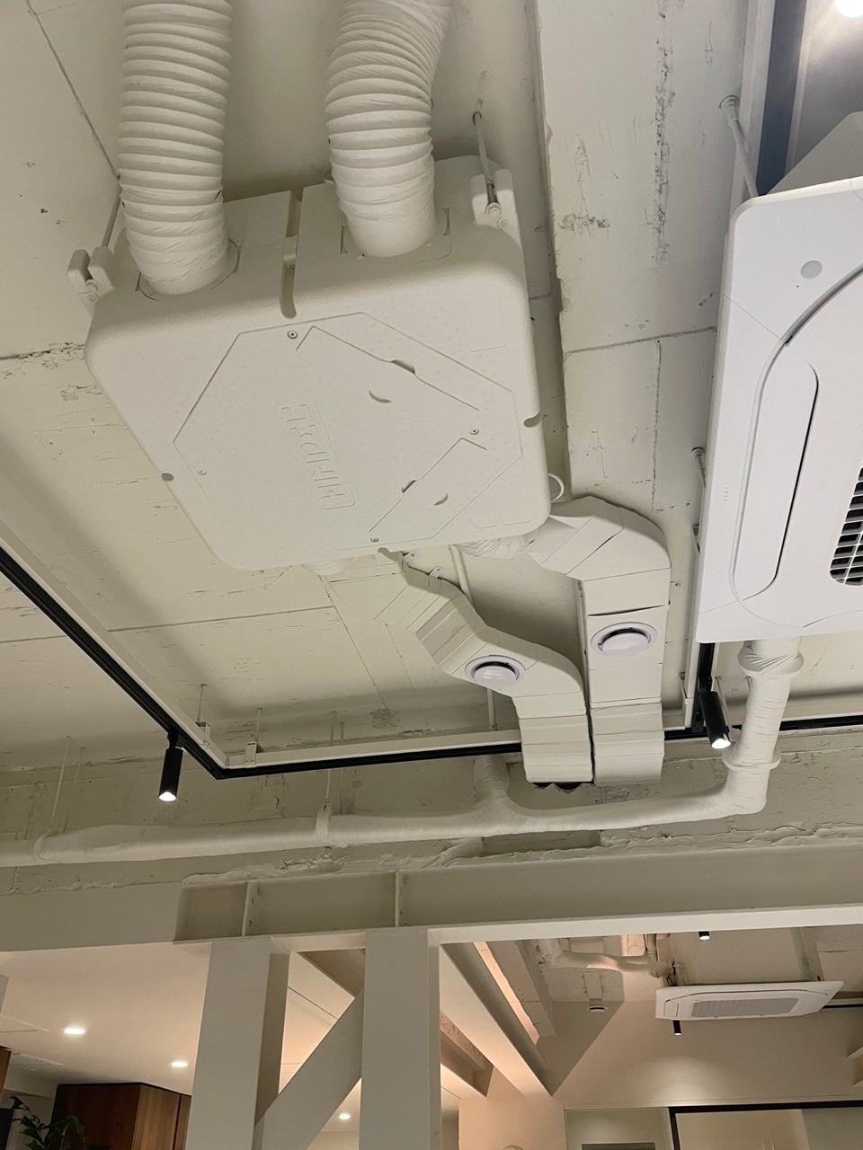 1층 거실의 전열교환기에서 외기 쪽의 덕트가 단열이 되어 있지 않은 것 같습니다. (그냥 주름관)