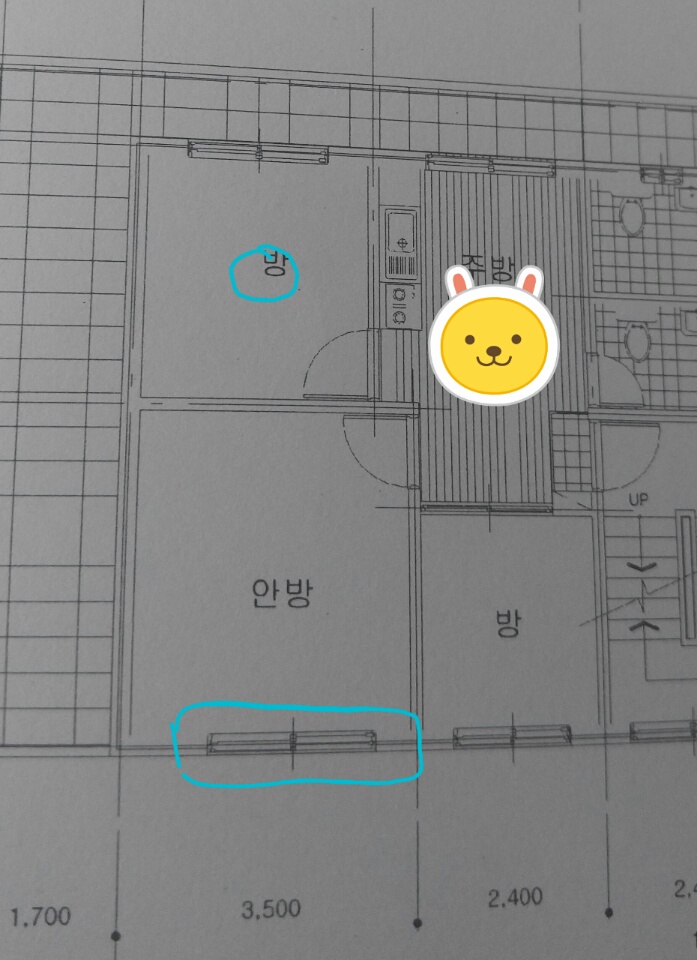사진에서 보이는것과 같이 파란색으로 된 부분의 방에 중간부분에서 비오는날 누수가 됩니다.