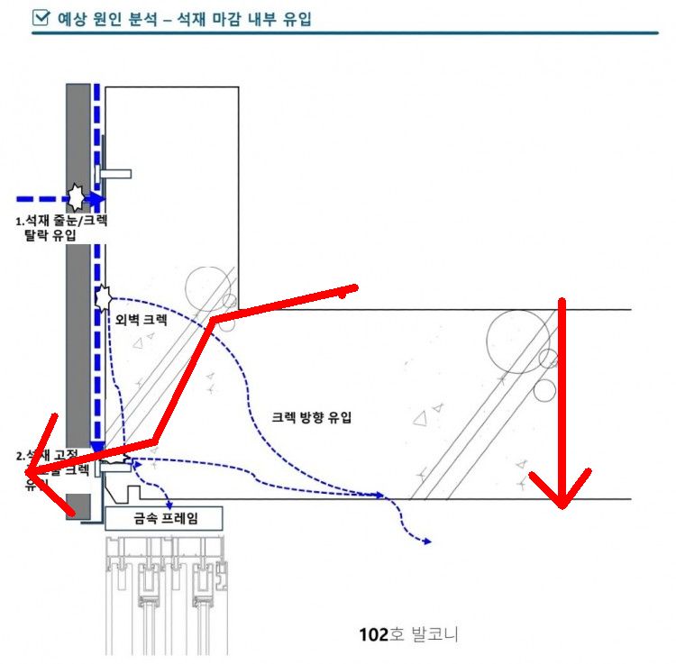 1. 왼쪽은 석재 마감으로 보이나, 누수가 있는 쪽은 돌이 아니라 콘크리트 표면에 페인트를 칠할 것으로 보이고,