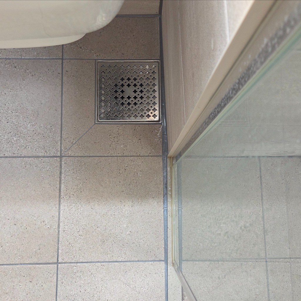 2방법 단점: 샤워부스 문이 있는 부분부터는 기울어 진 채로 있는거라 사진에서 바닥쪽 선 그은 부분은 해결되지만 나머지 부분은 줄눈 두꺼운 채로 남음.