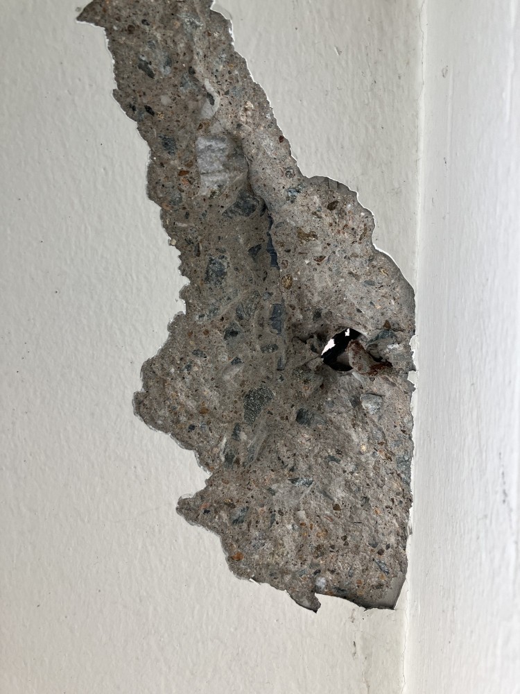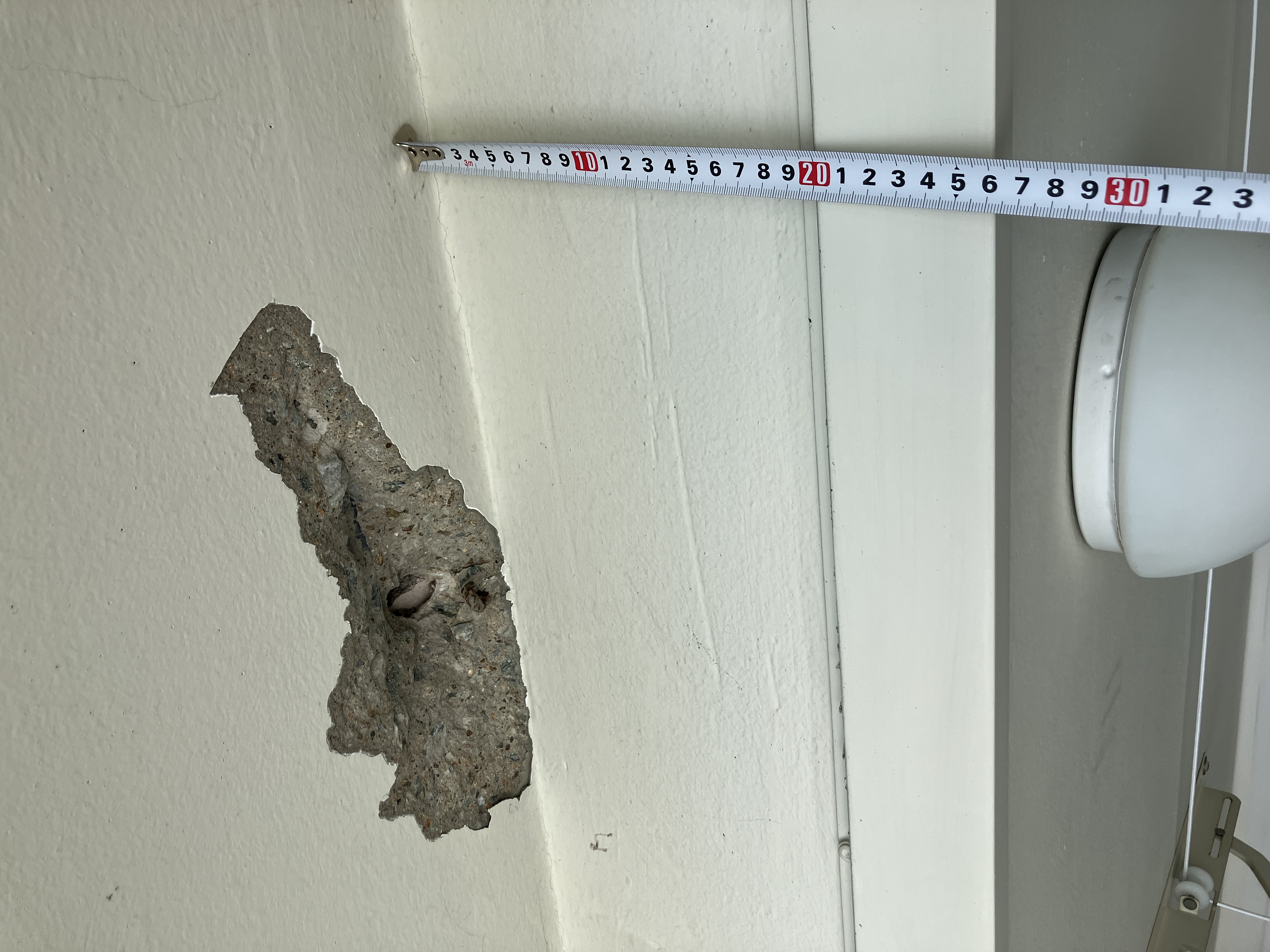 위에 인테리어 업자는 괜찮은 거라면서 해결해준다고 하는데 떨어진 조각이 콘크리트이고, 철근 끝도 살짝 보여서 정말 업자말대로 괜찮은 것인지 의문이 갑니다.