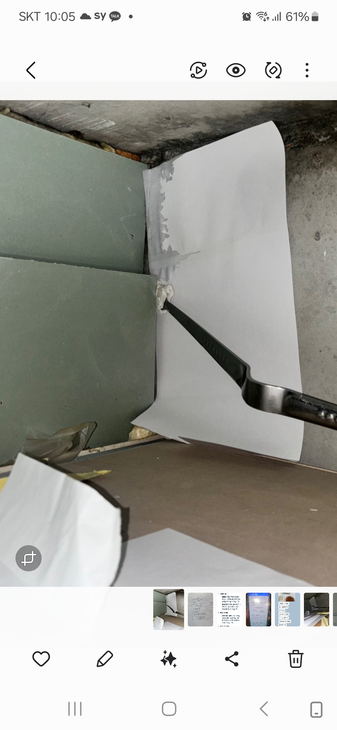 중간에일이있었는데 물을틀어놓았을때 별큰반응은 없었으나물을평시처럼사용하니 저희집 화장실 천장벽변이 또좆었어요ㅜㅜ그것들을 말린후