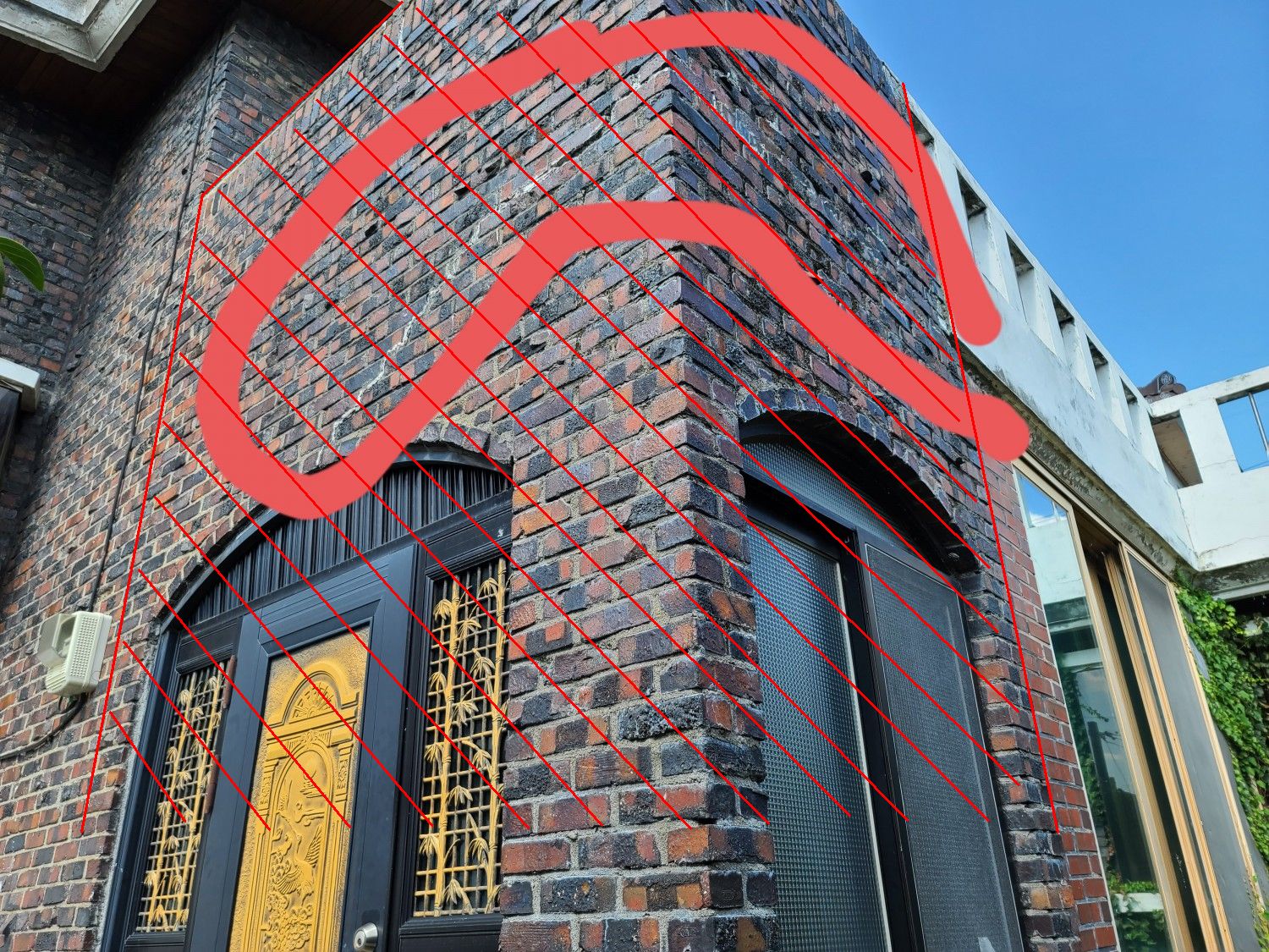 좌우 문을 포함한 모서리 영역을 새로 시공하는 것이 더 낫긴 합니다. 돌출된 것으로 보아서.. 벽돌 자체가 구조체와 연결되어 있지 않은 것 같거든요. 하지만 다 비용인지라... 그리고, 지금은 구하고 싶어도 구할 수 없는 벽돌이기도 하고요..